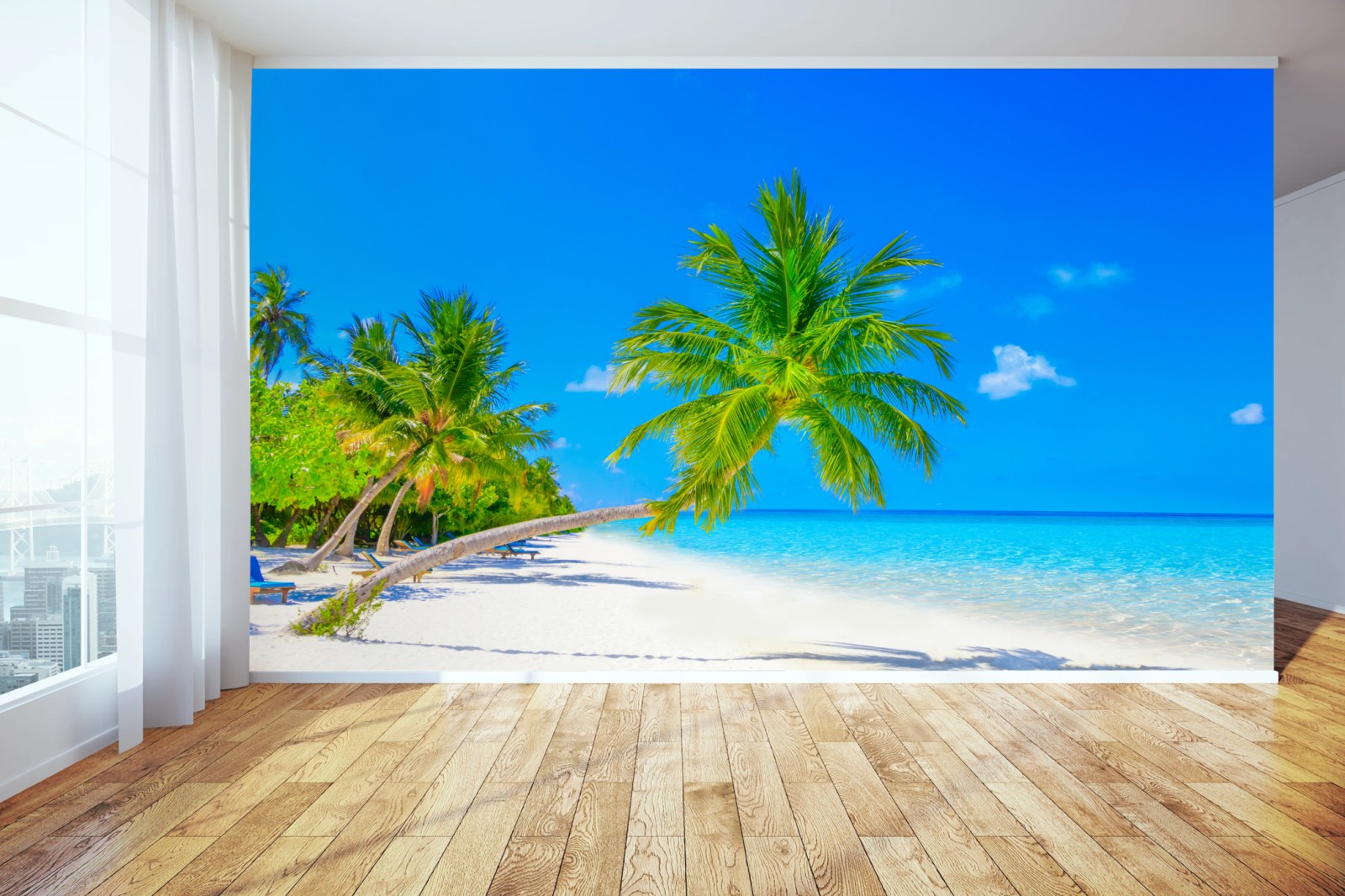 Verleihen Sie Ihrem Raum tropische Ruhe mit sonnigem Strand, kristallklarem Wasser und wiegenden Palmen der Malediven.MehrWeniger