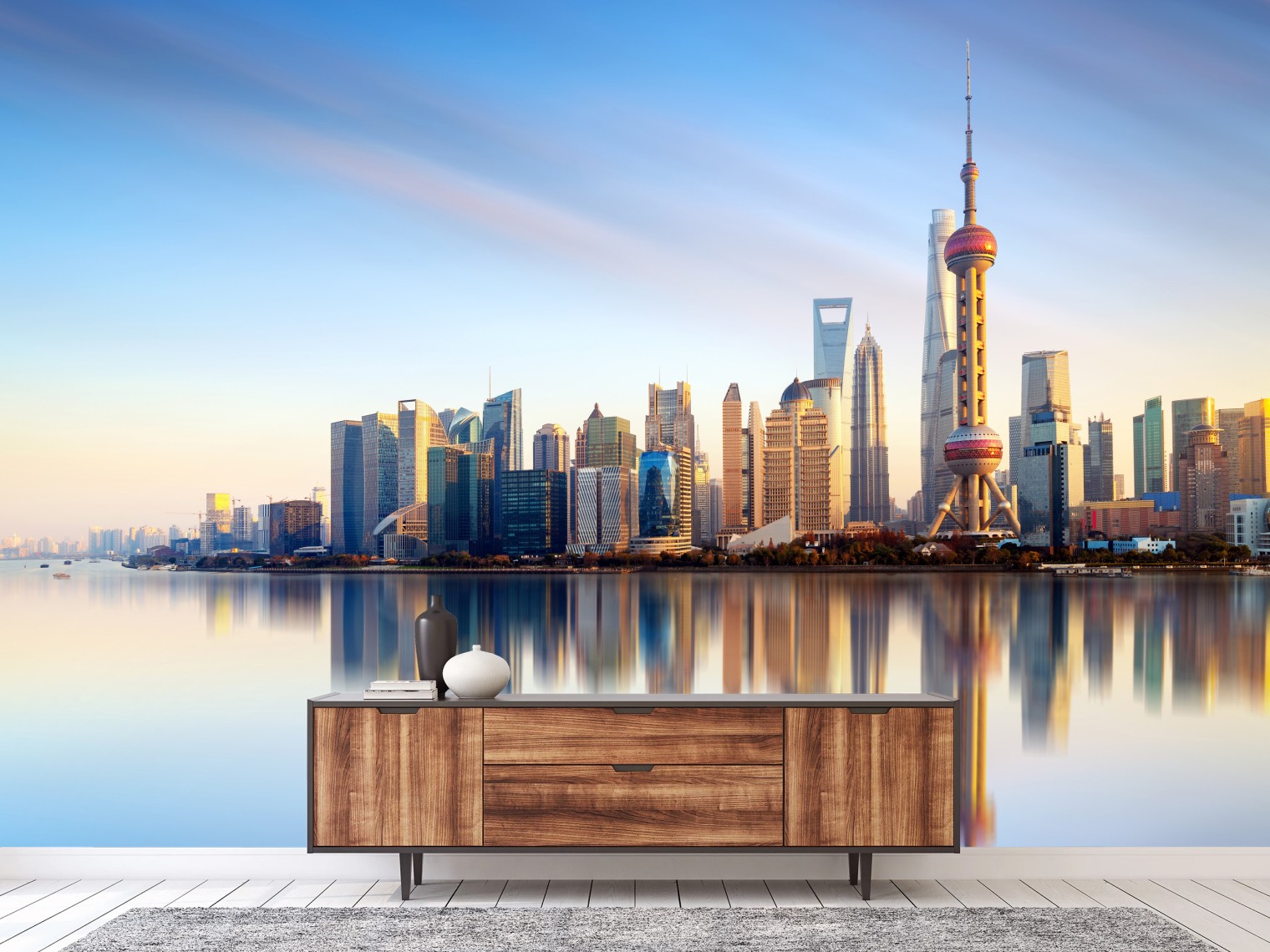 Fototapete Shanghai skyline spiegelung bei sonnenaufgang