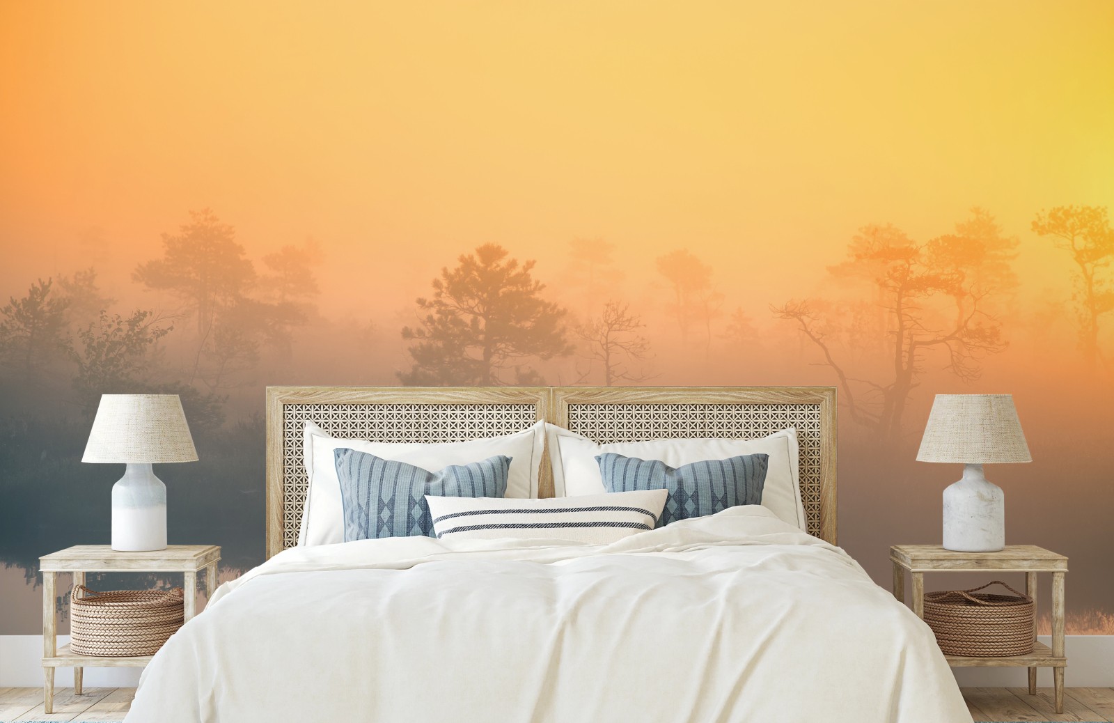 Fototapete Träumerischer sonnenaufgang über nebligem moor