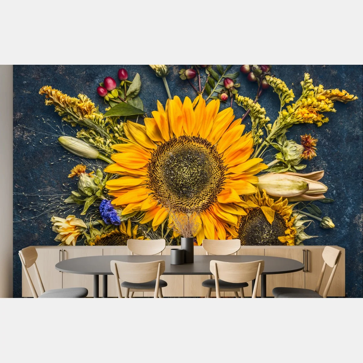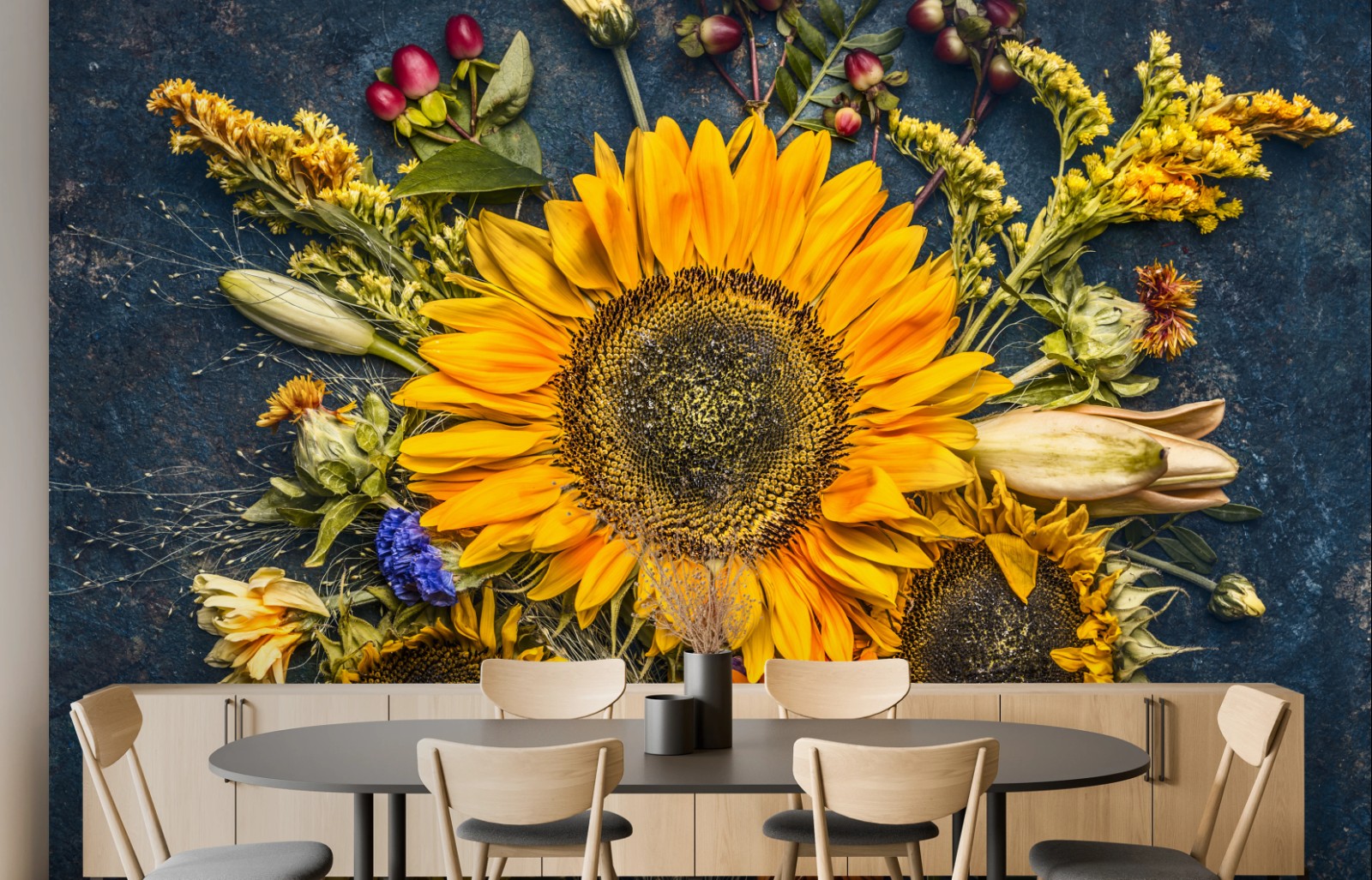 Fototapete Herbstlicher sonnenblumenstrauß auf dunklem rustikalem hintergrund