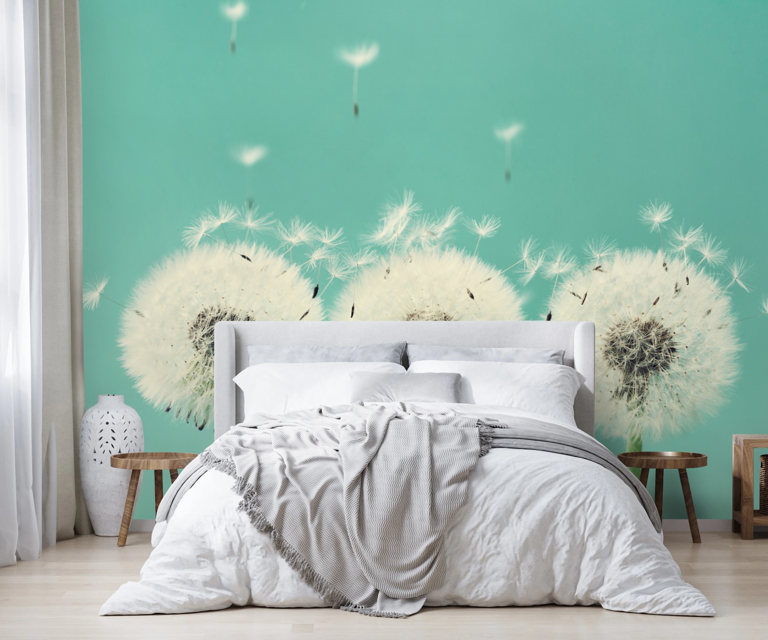 Fototapete Drei löwenzahn-pusteblumen auf türkisgrund
