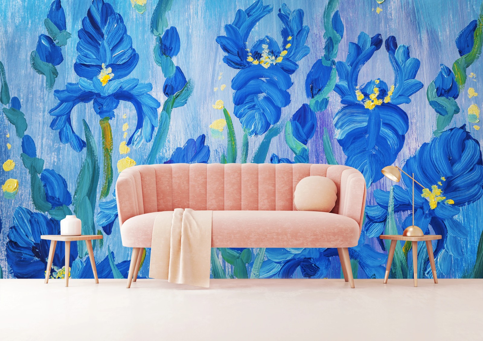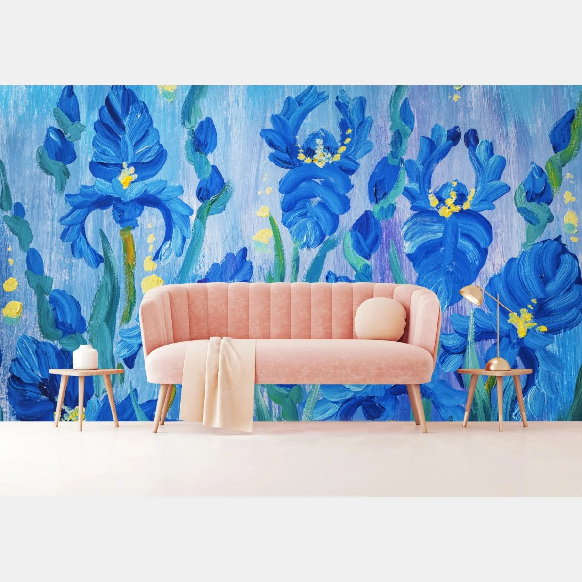 Ein eindrucksvolles Ölgemälde mit kräftigen blauen Irisblüten, das jedem Raum lebendige Farbe und botanische Eleganz verleiht.MehrWeniger