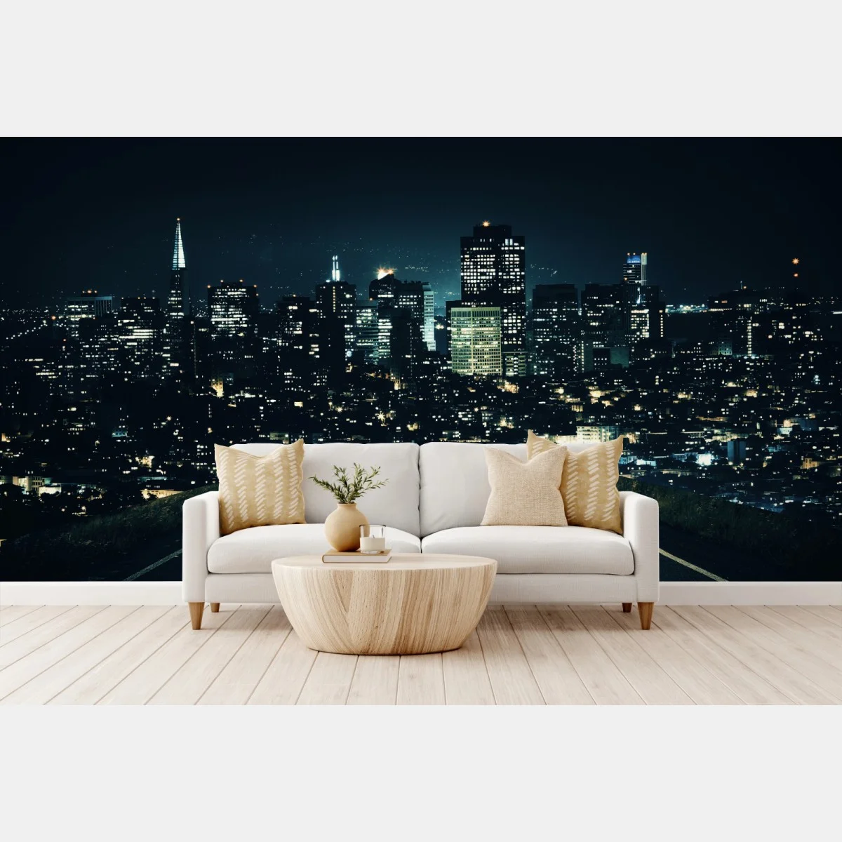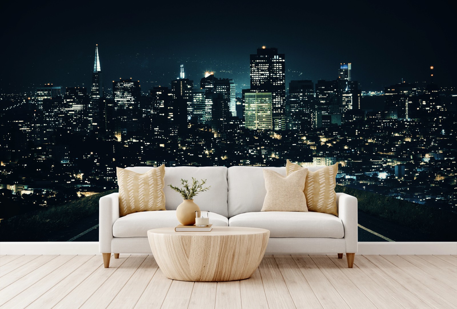Dramatische nächtliche Stadtansicht mit einer Straße, die zur beleuchteten Skyline führt, ideal, um modernen urbanen Charme an die Wand zu bringen.MehrWeniger