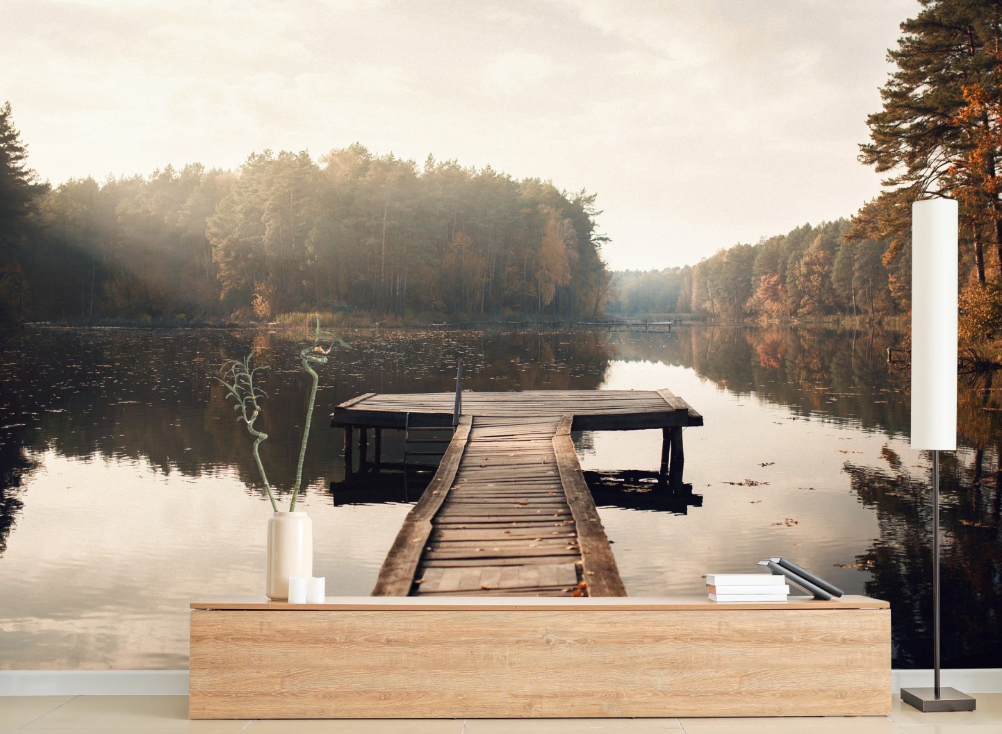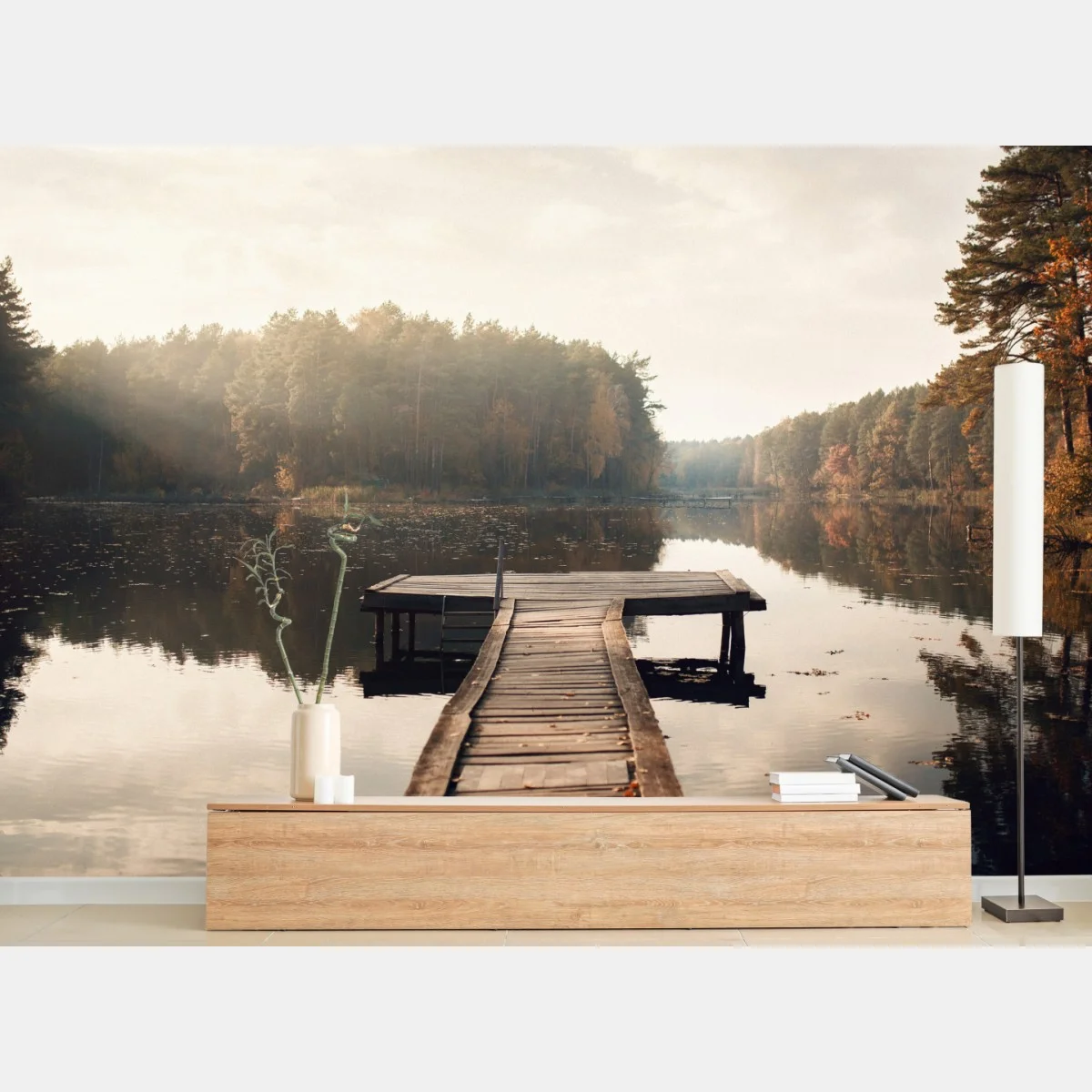 Fototapete Herbstmorgen am see mit hölzernem steg