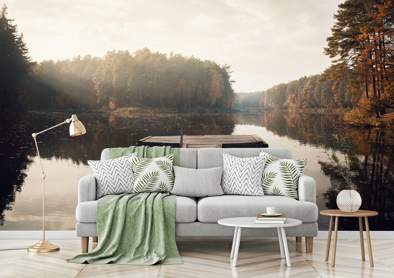 Fototapete Herbstmorgen am see mit hölzernem steg