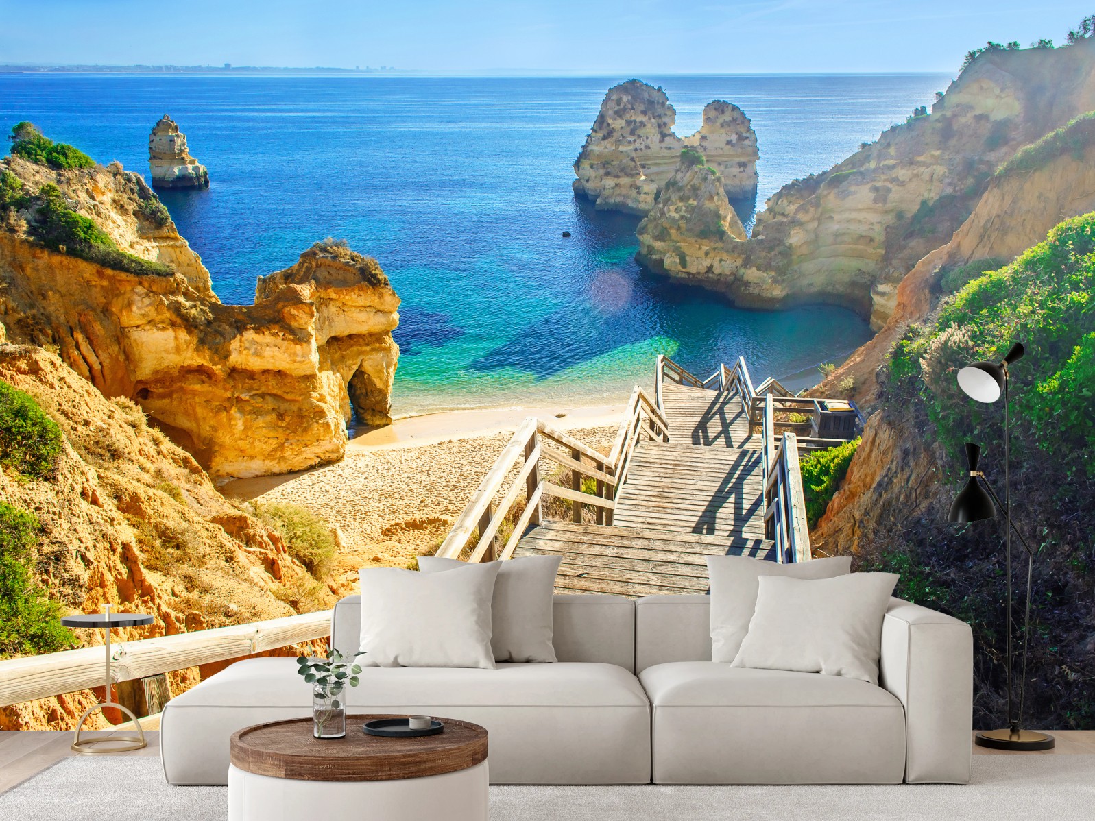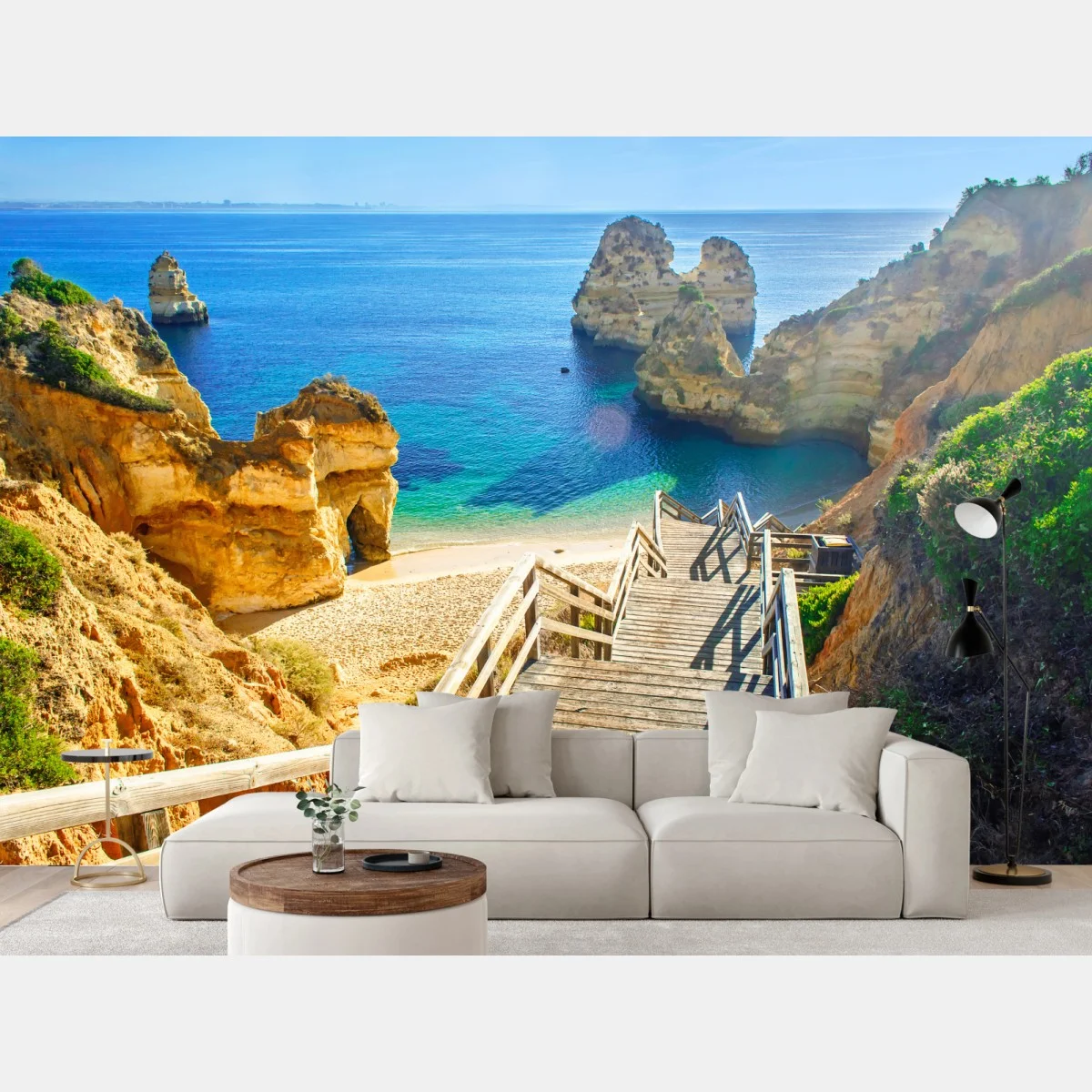 Fototapete Sonnige treppe zur türkisfarbenen bucht
