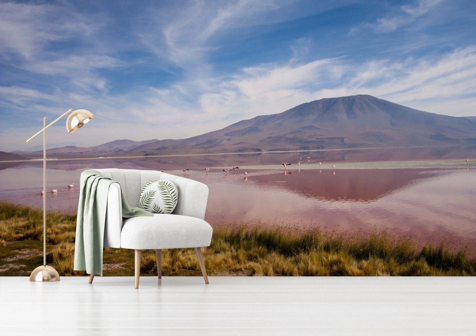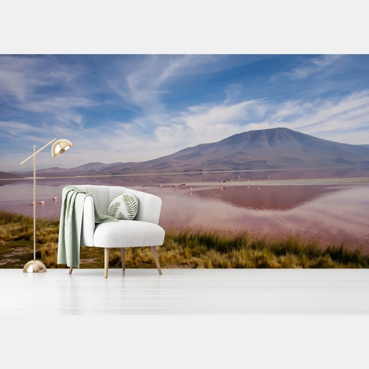 Fototapete Rosa lagune mit flamingos und bergspiegelung