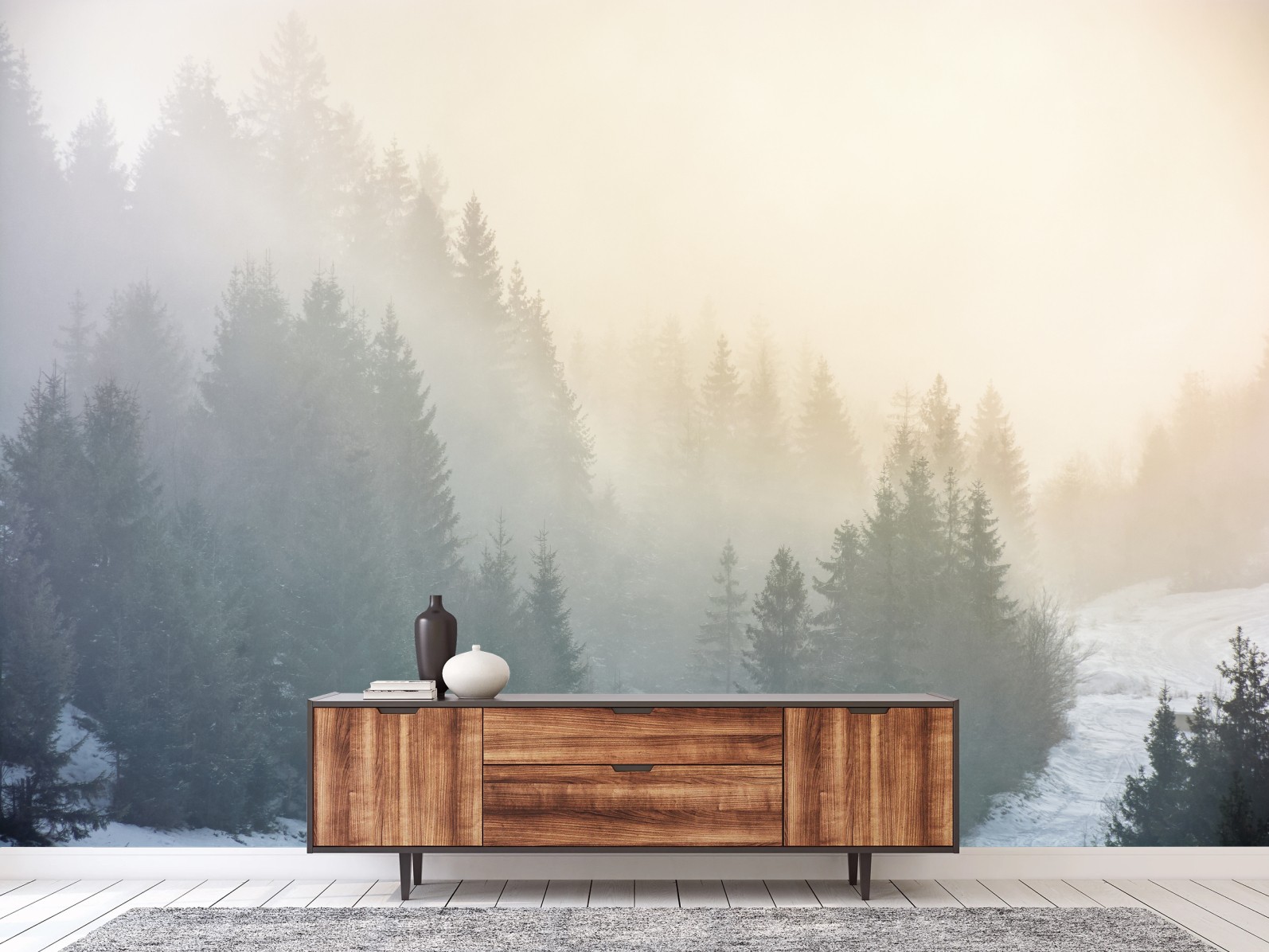 Fototapete Nebliger fichtenwald bei sonnenaufgang