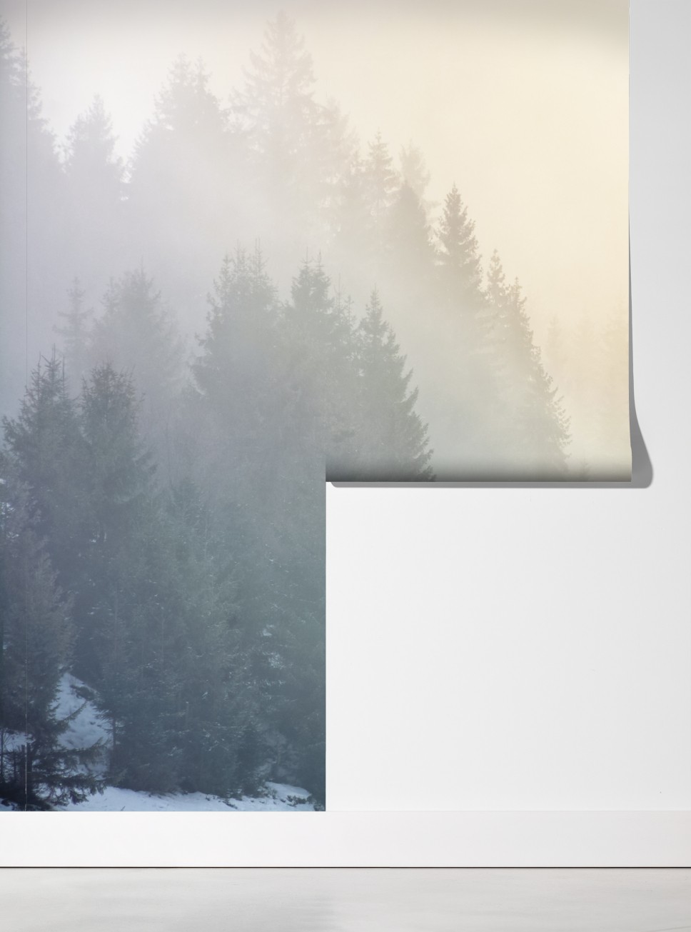 Fototapete nebliger fichtenwald bei sonnenaufgang – Wallnifity®