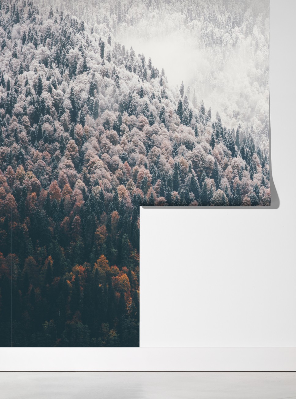 Eine ruhige Bergwaldszene, die herbstliche Farben mit frischem Schnee und Nebel verbindet und Ihrem Raum natürliche Gelassenheit verleiht.