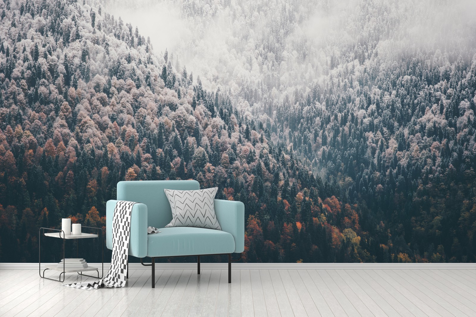 Fototapete Nebliger herbstwald am schneebedeckten berg