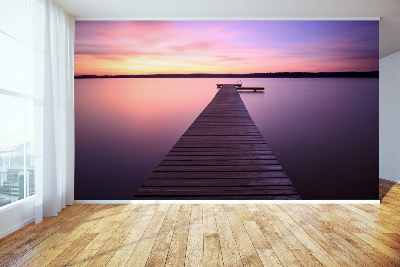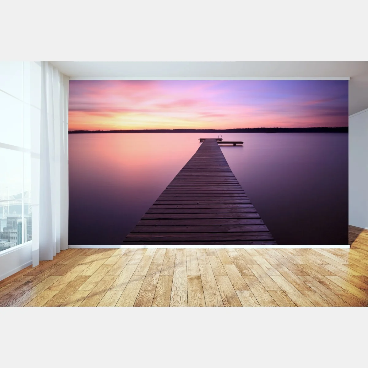 Fototapete Ruhiger pastellsonnenuntergang am see mit steg