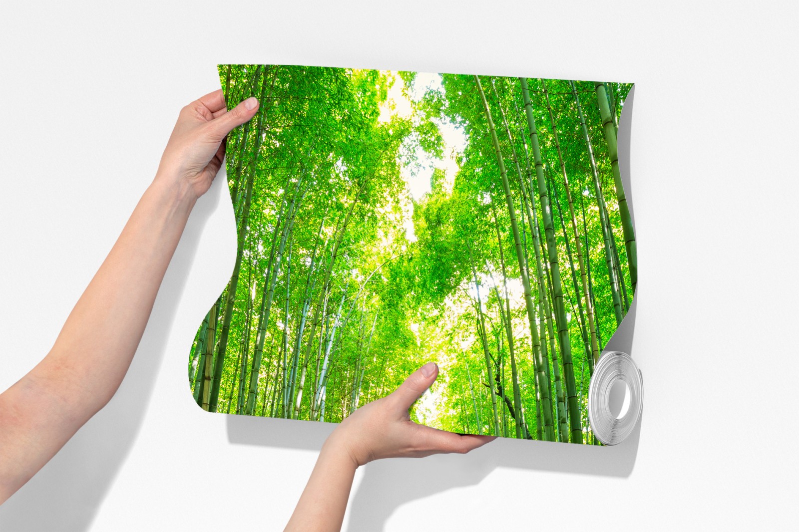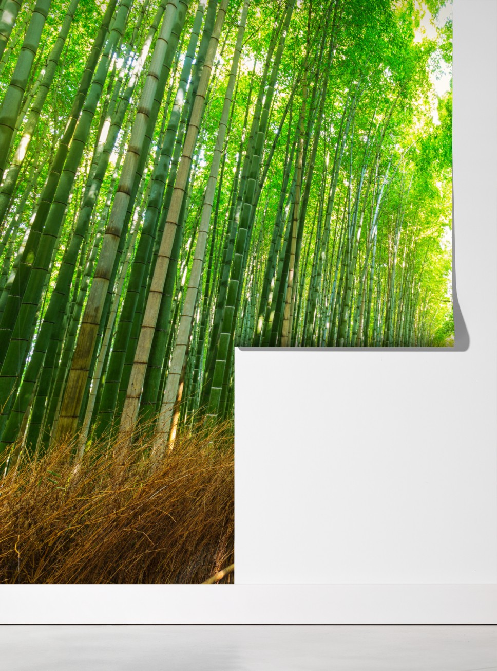 Bringen Sie die beruhigende Atmosphäre des Bambuswaldes von Arashiyama in Ihre Räume mit diesem lebendigen, grünen Motiv voller vertikaler Linien und Natur.