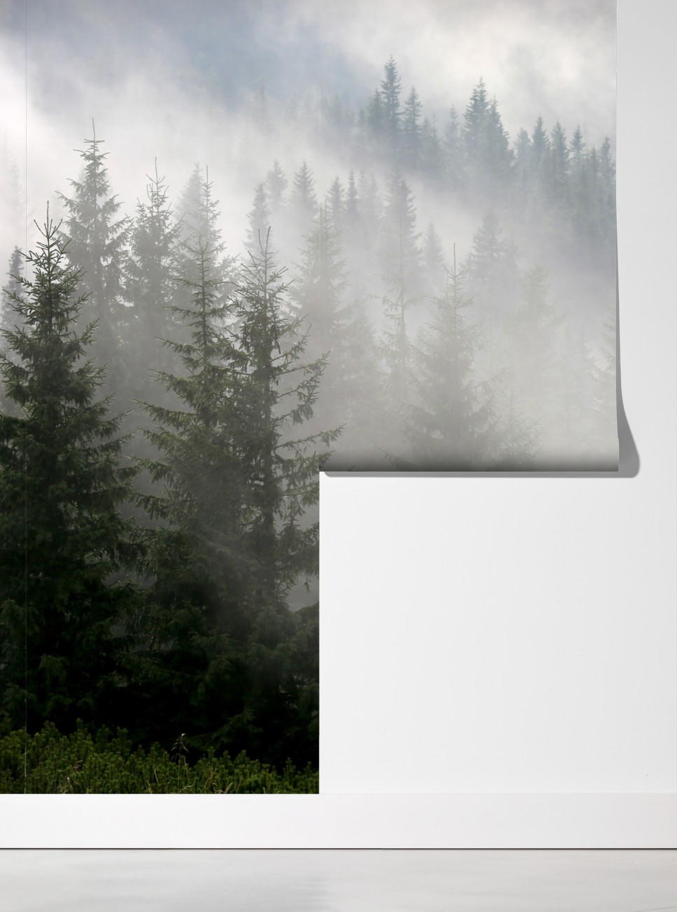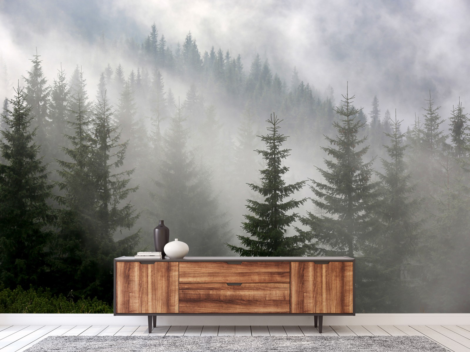 Ruhige szene eines nebligen kiefernhains, die jedem raum stimmung und tiefe verleiht.