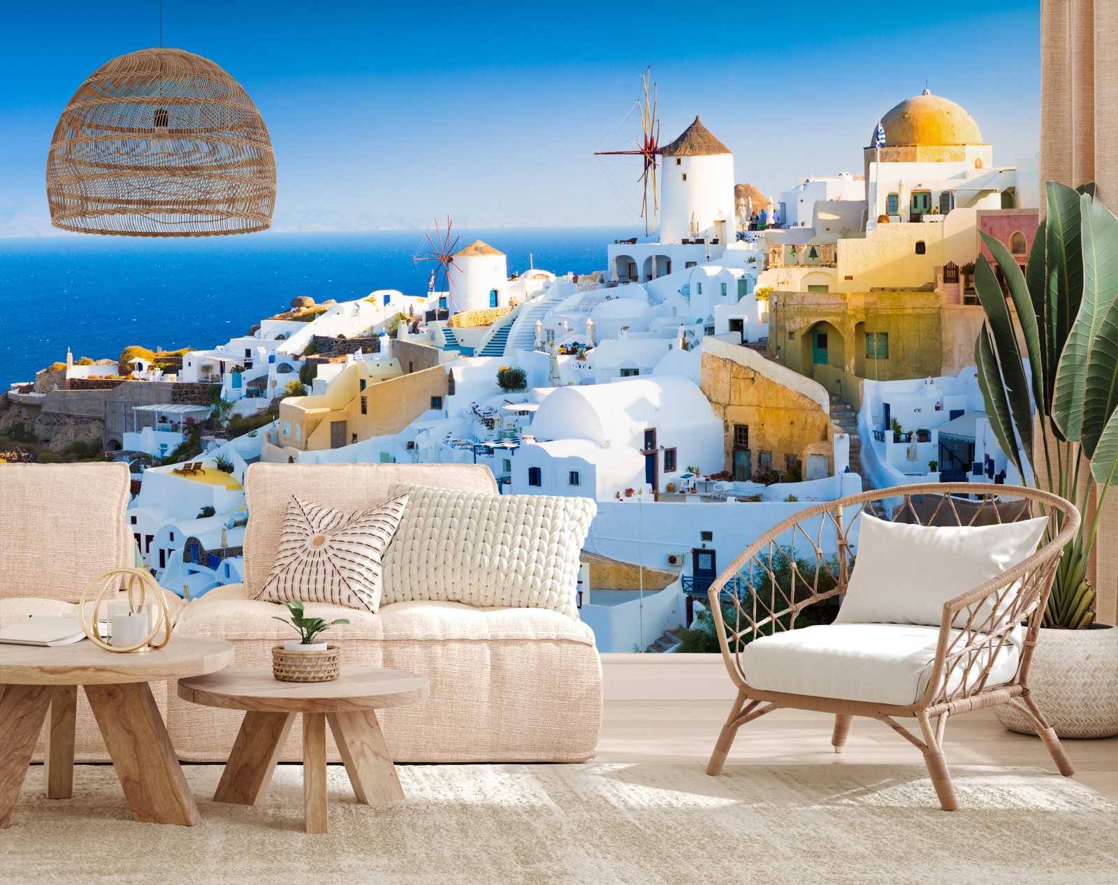 Fototapete Sonnenbeschienenes Santorini-dorf am meer