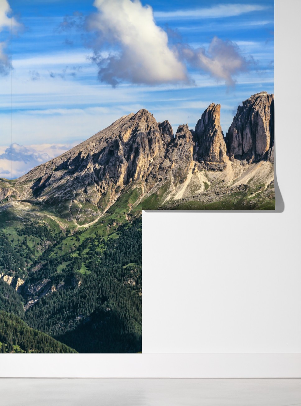 Ein atemberaubendes Bergpanorama mit markanten Felsgipfeln und üppigem grünen Vordergrund, das Ruhe und Inspiration in jeden Raum bringt.