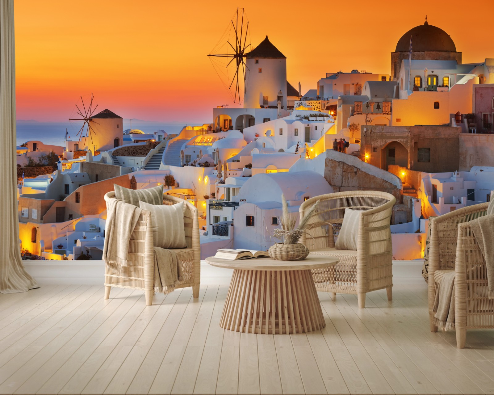 Fototapete Goldener sonnenuntergang über Oia, Santorini