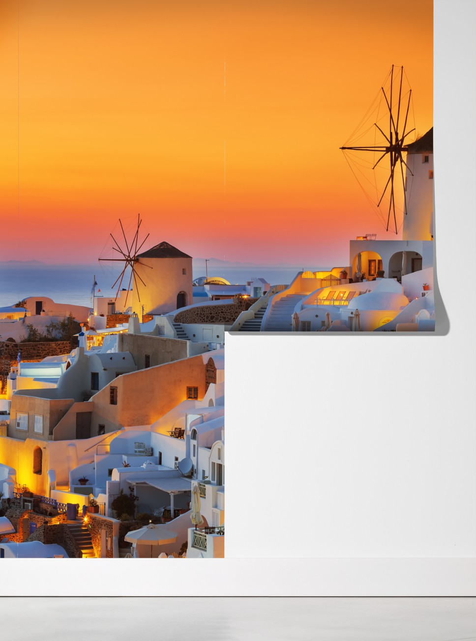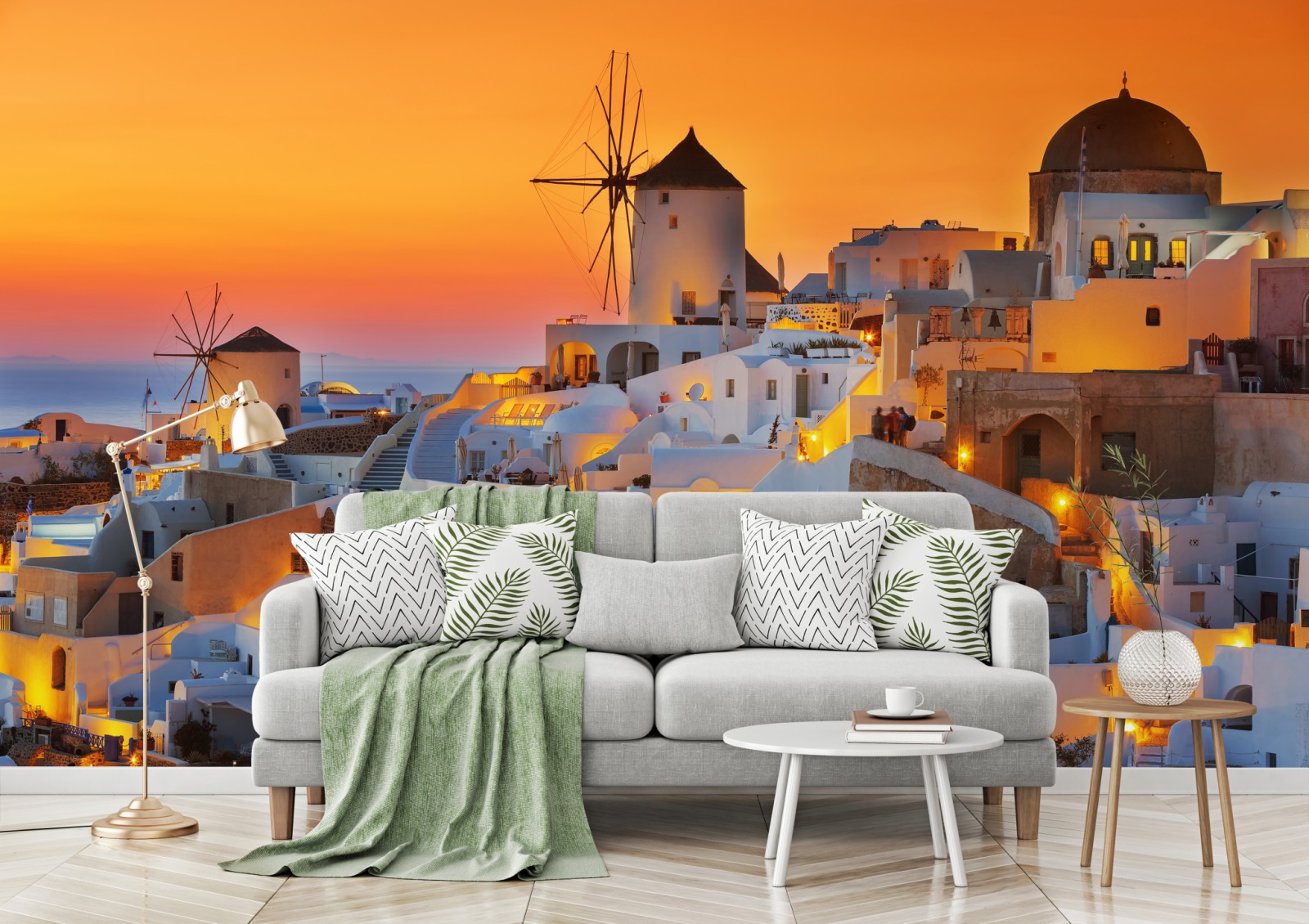 Ein warmer, goldener Sonnenuntergang taucht die ikonischen weißen Häuser und Windmühlen von Oia auf Santorini in ein ruhiges, mediterranes Licht und schafft eine perfekte Stimmung für jedes Wohnzimmer.