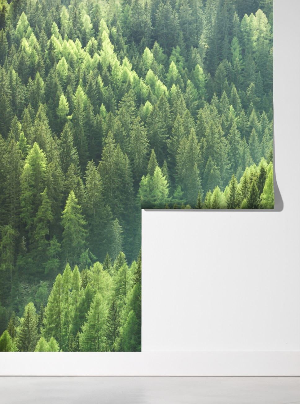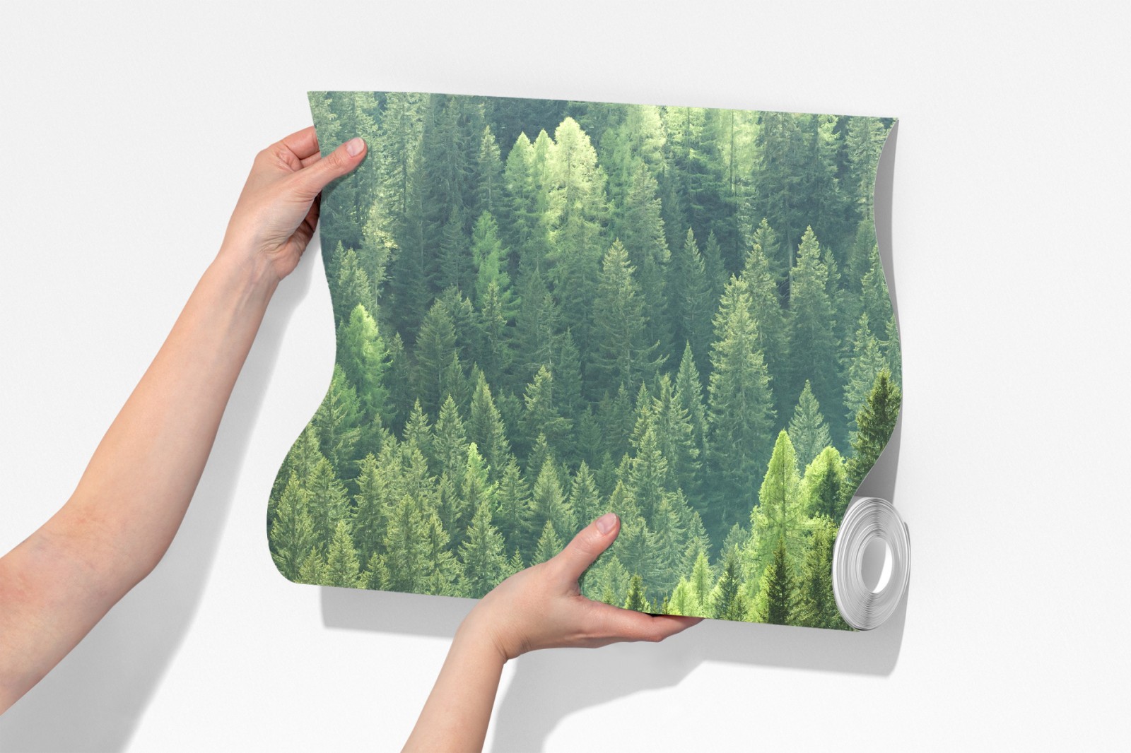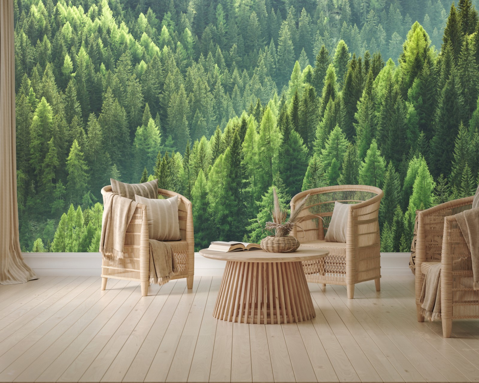 Eine beruhigende Luftaufnahme eines dichten immergrünen Waldes, die natürliche Ruhe und frische grüne Töne in jeden Raum bringt.