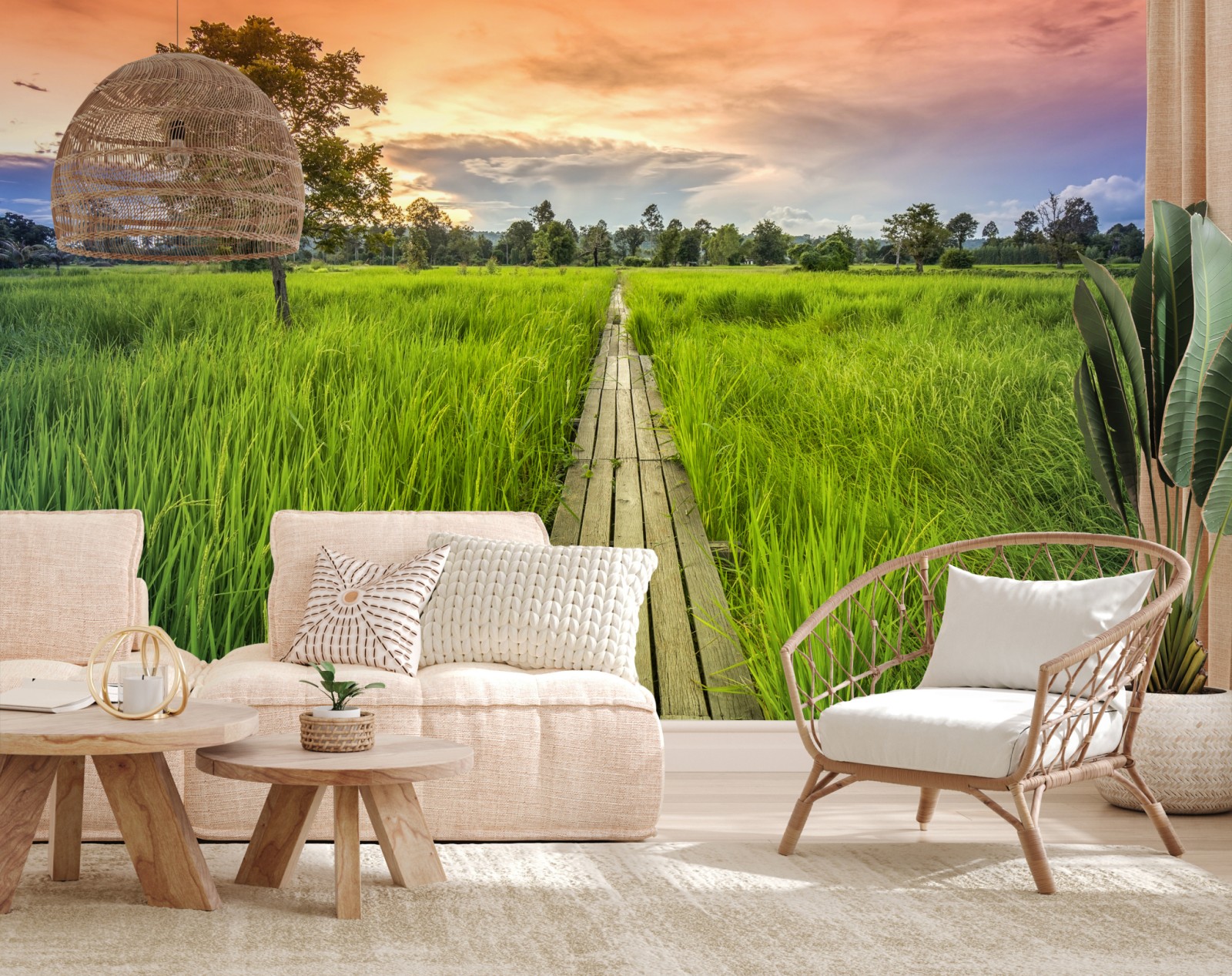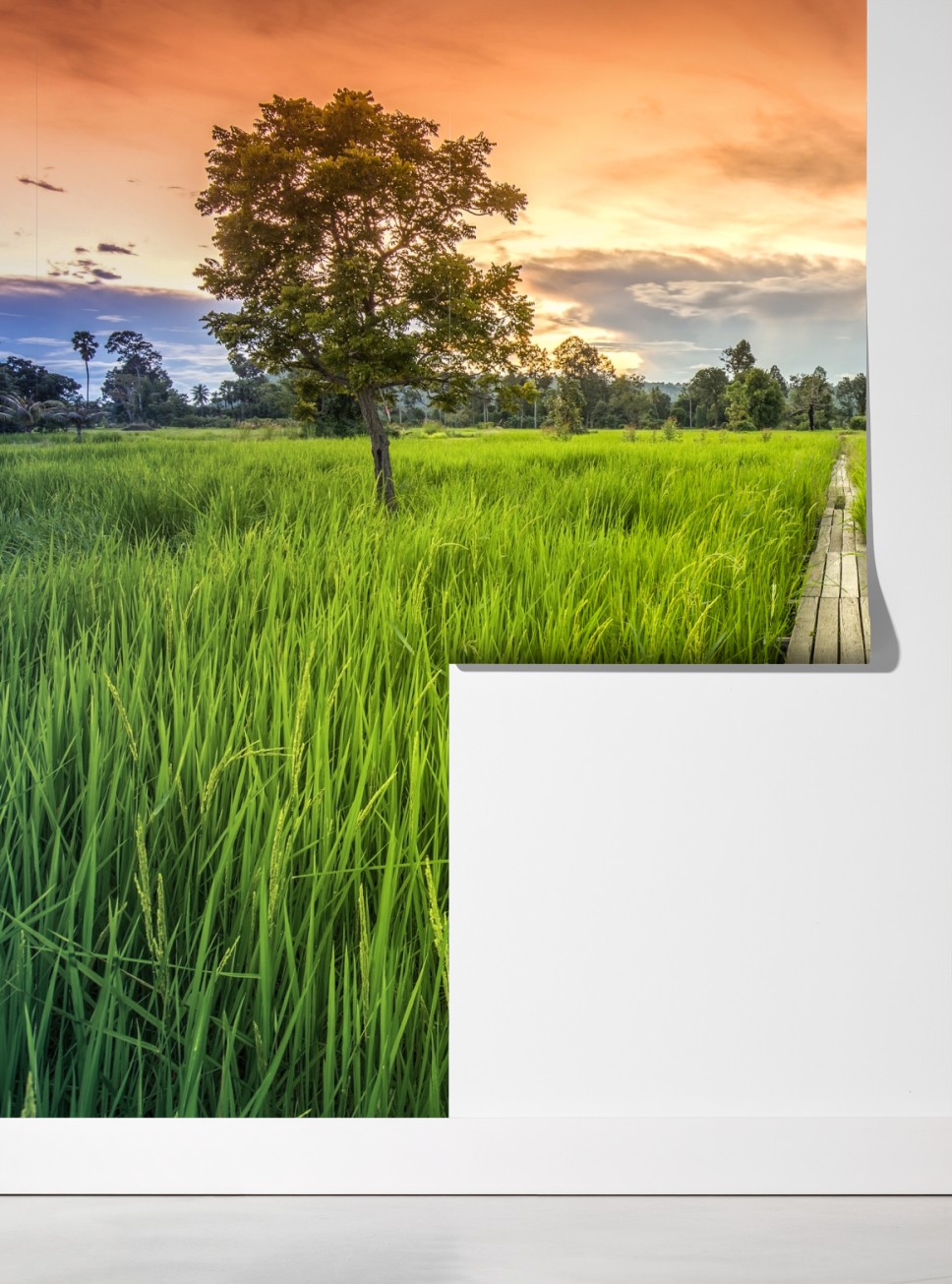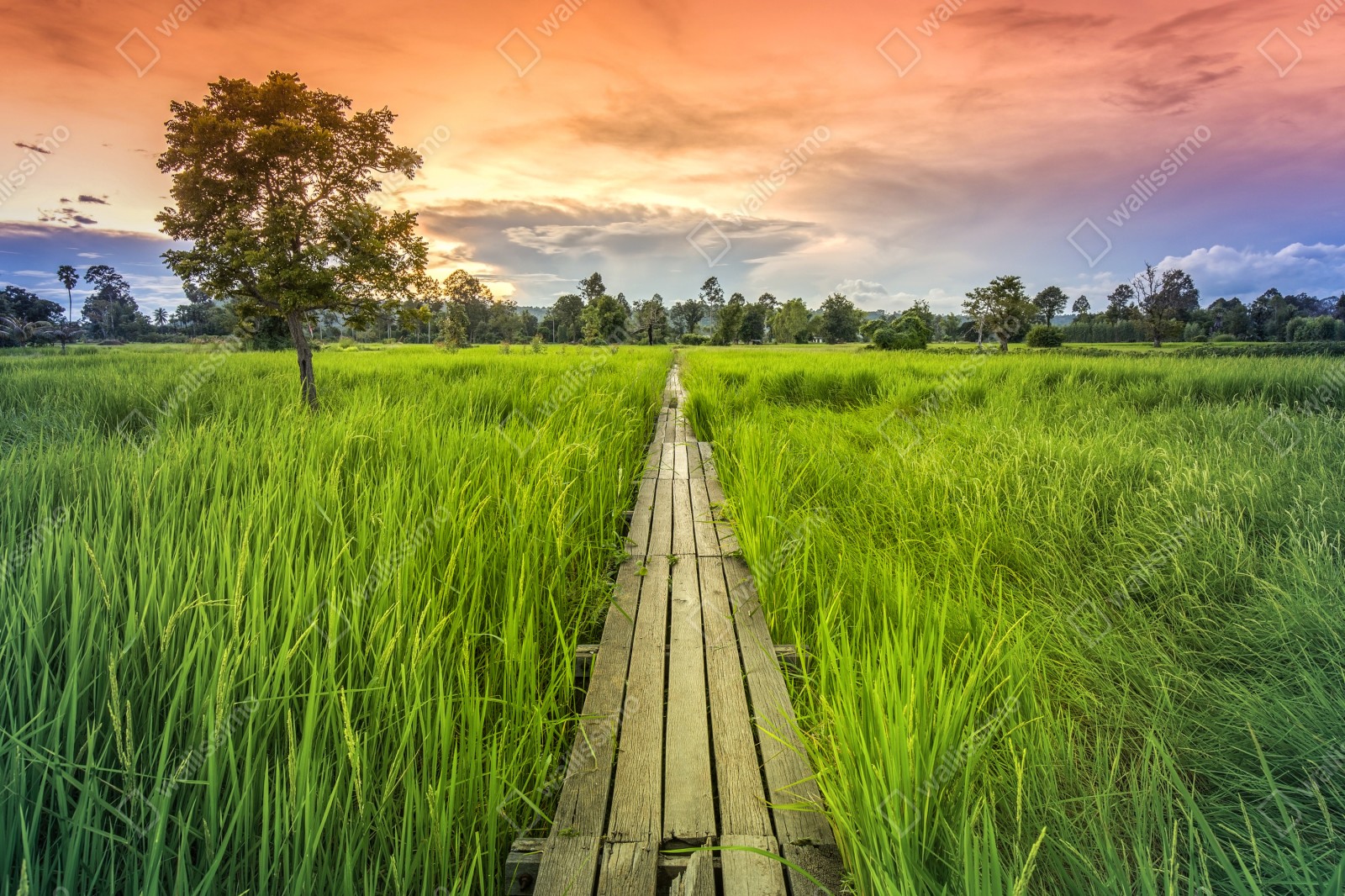 Ruhige Szenerie mit einer 100 Jahre alten hölzernen Brücke über smaragdgrünen Reisfeldern bei Sonnenuntergang in Khonburi, ideal zur Dekoration von Wohnräumen.