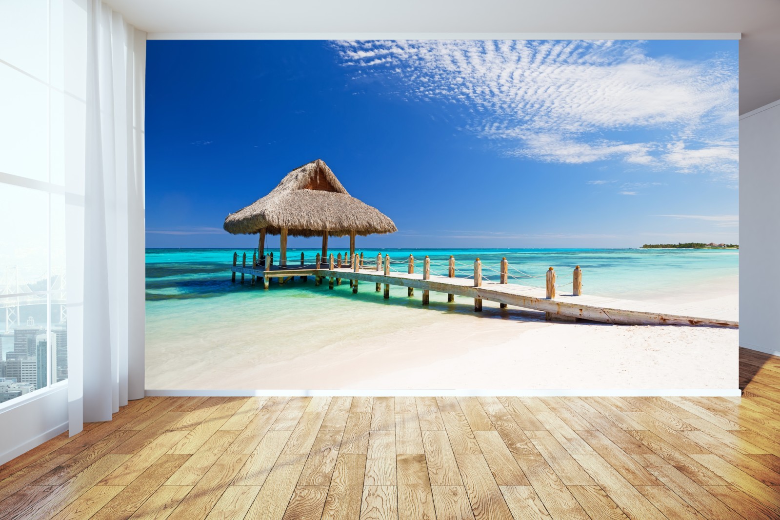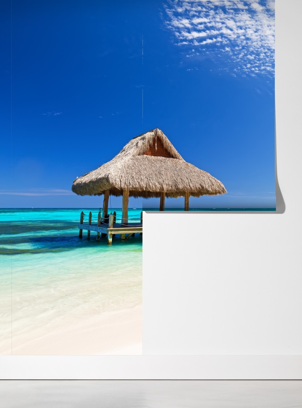 Bringen Sie die Ruhe eines dominikanischen Strandes in Ihr Zuhause mit leuchtendem türkis, weichem weißem Sand und einem rustikalen Strohdachsteg.