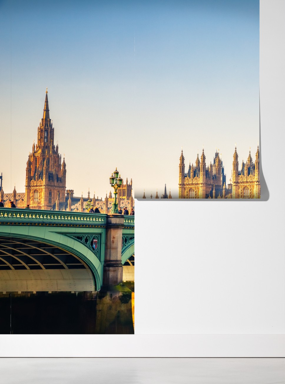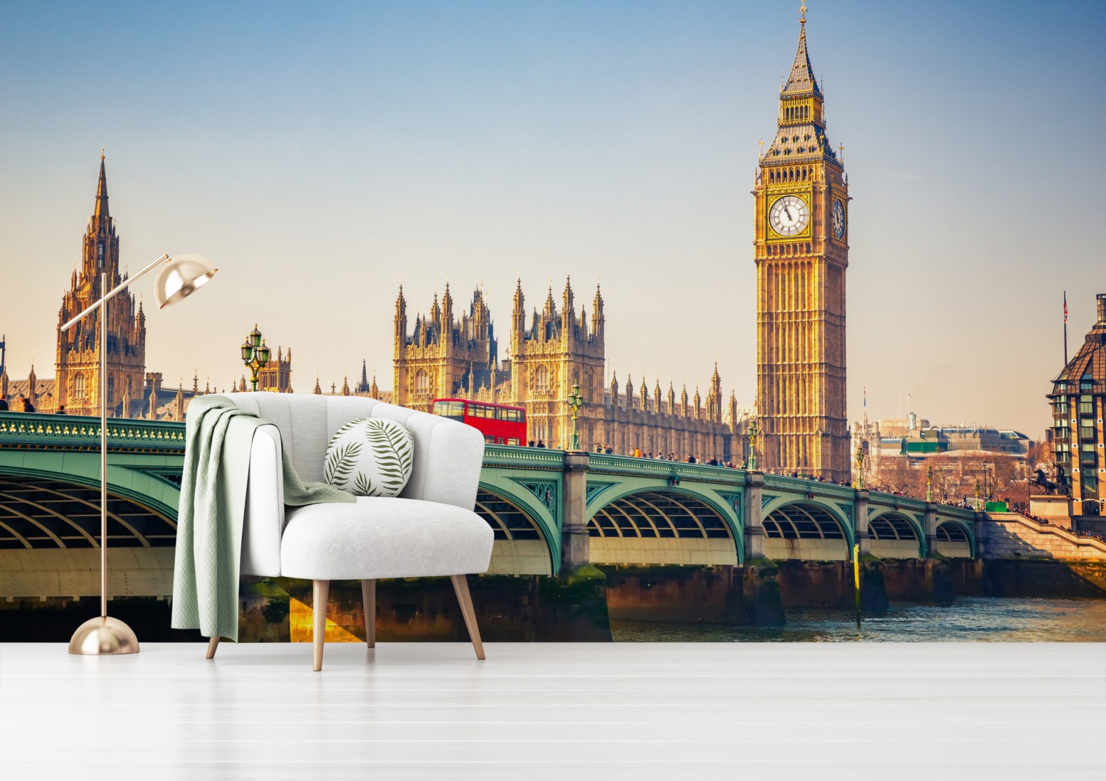 Warmes sonniges Foto von Big Ben und der Westminster Bridge über der Themse, ideal um ikonischen London-Charme an Ihre Wände zu bringen.