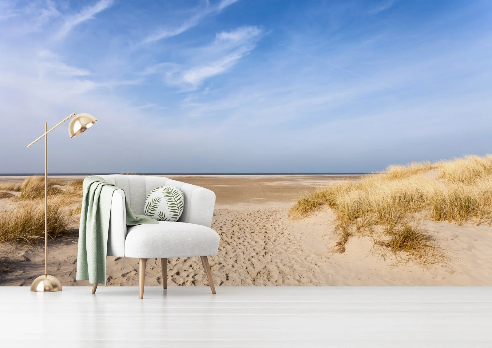 Eine ruhige Küstenszene mit Sanddünen und weitem Himmel, die Ruhe und Weite an Ihre Wände bringt.MehrWeniger