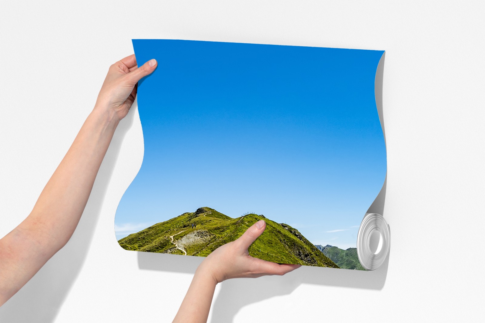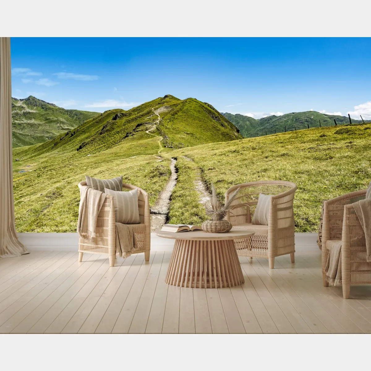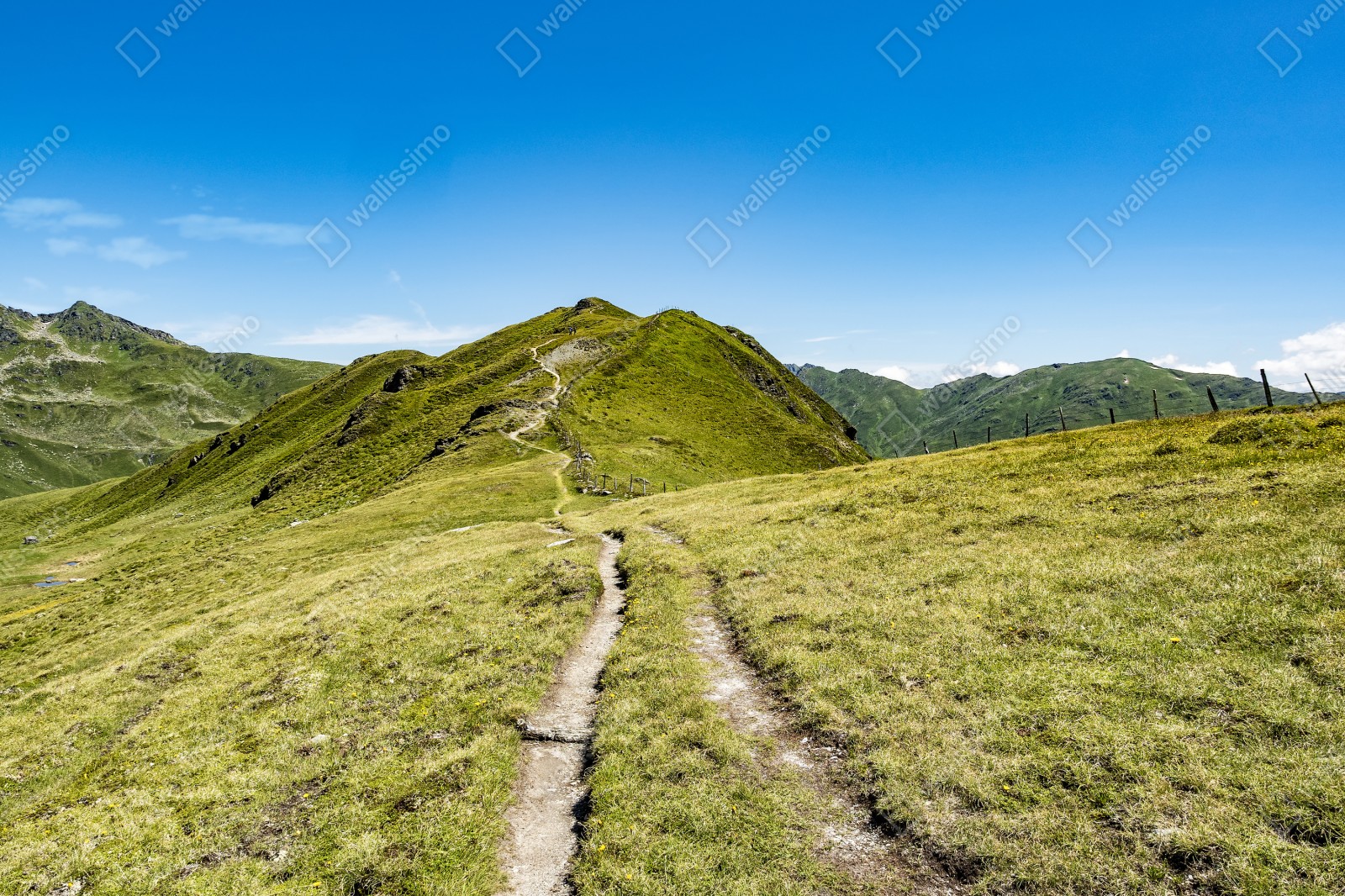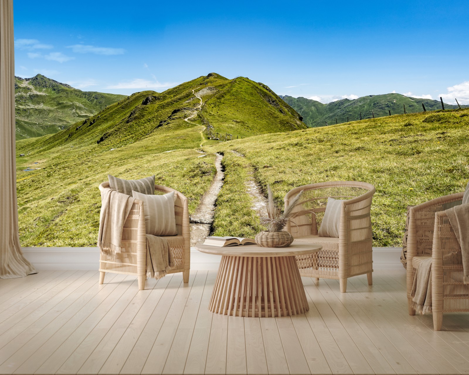 Bringen Sie Ruhe und Weite in den Raum mit diesem lebendigen Foto eines gewundenen Wanderwegs durch die Zillertal-Alpen unter klarem blauem Himmel.