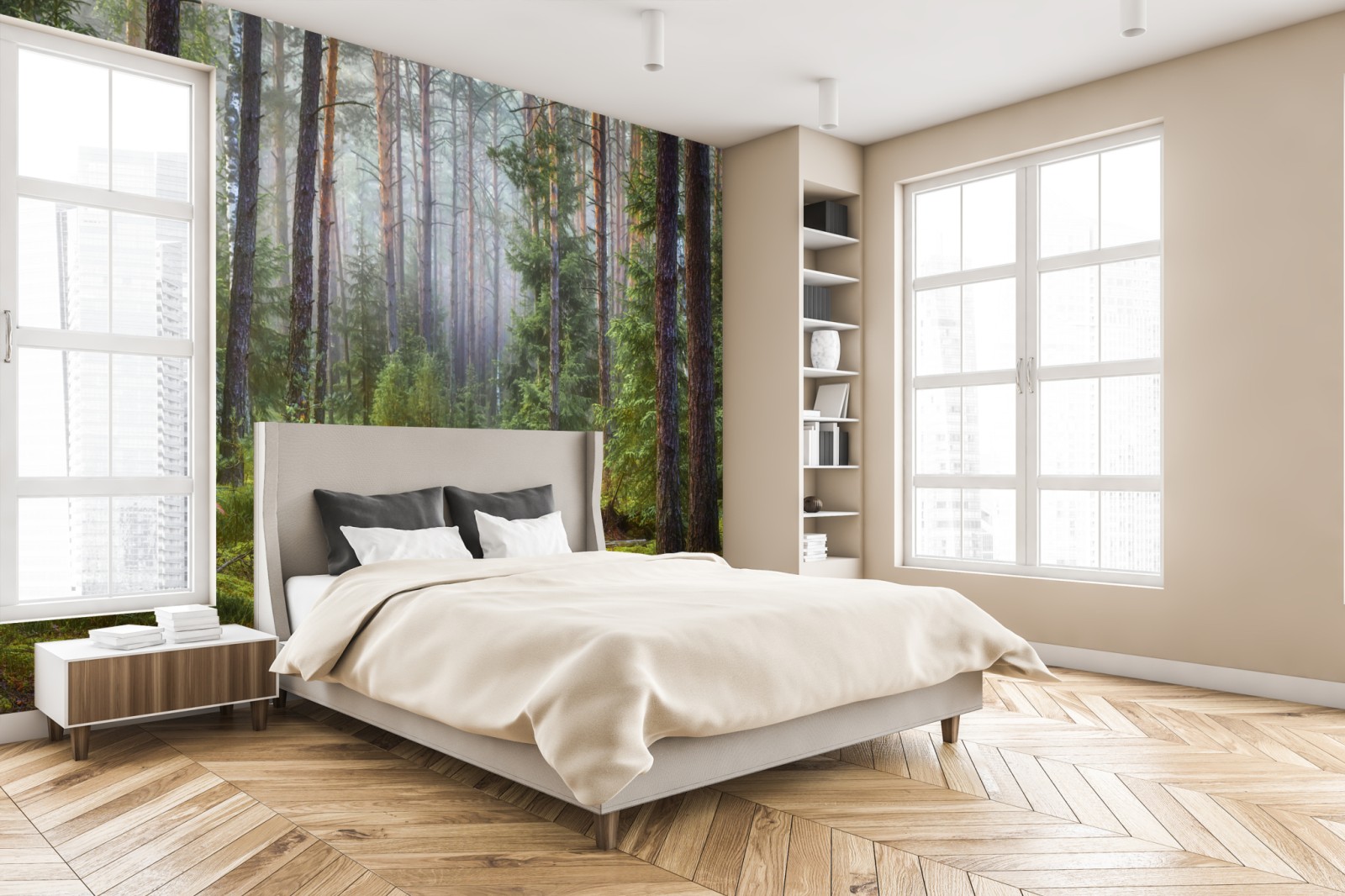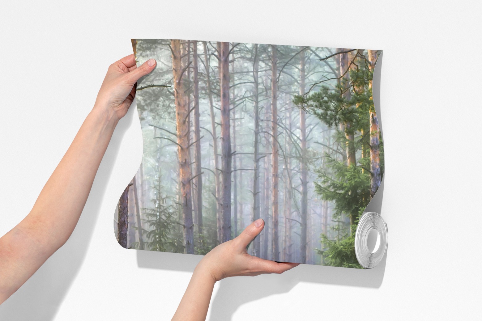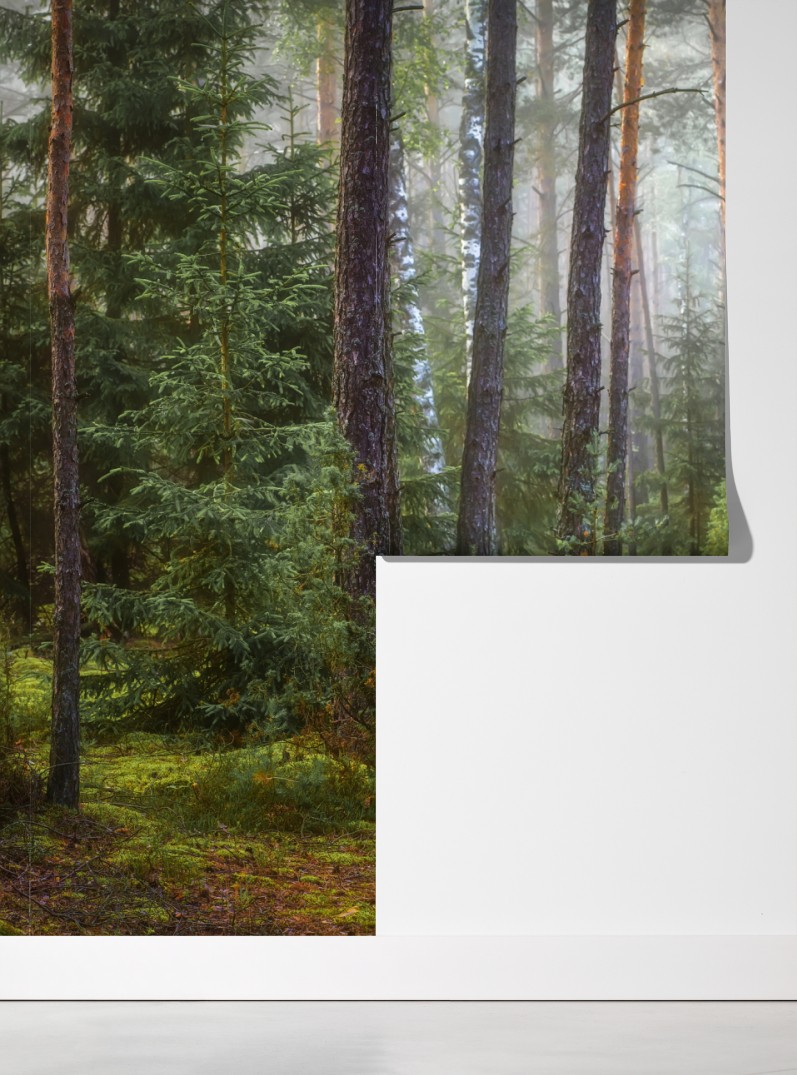 Eine ruhige, neblige Kiefernwaldszene bringt beruhigendes Grün und natürliche Tiefe in jeden Raum.