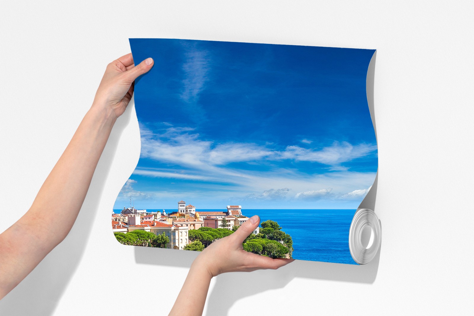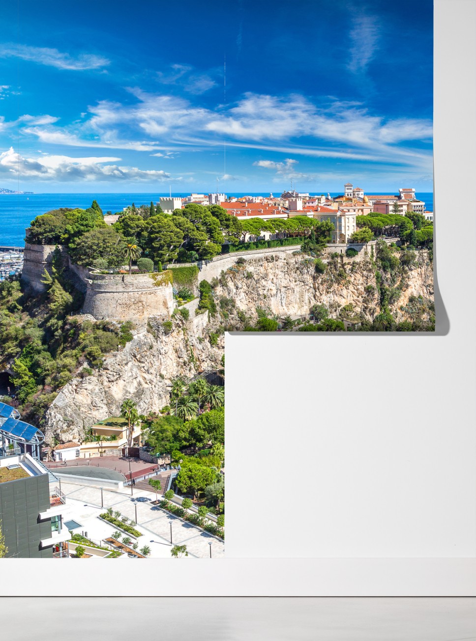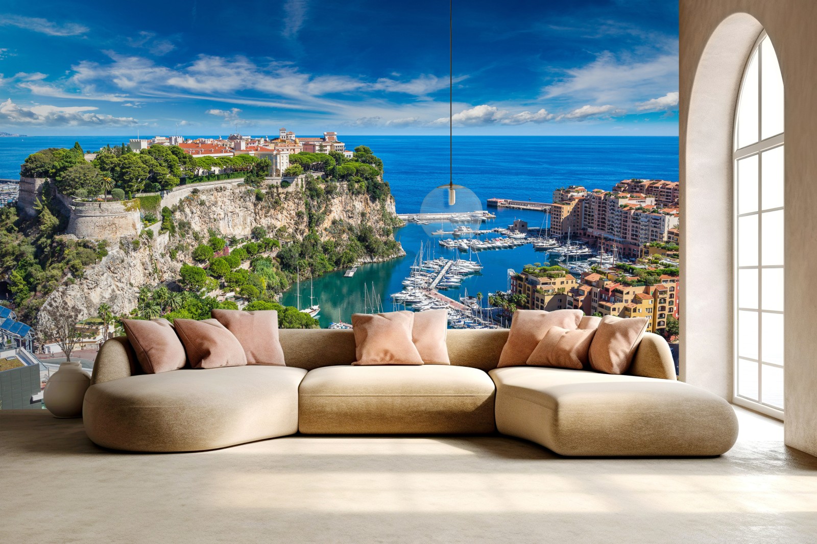 Atemberaubendes Panoramafoto des Palastes und der Marina von Monte Carlo mit tiefblauem Meer und sonnenverwöhnten Klippen, ideal, um Räumen mediterranes Flair zu verleihen.
