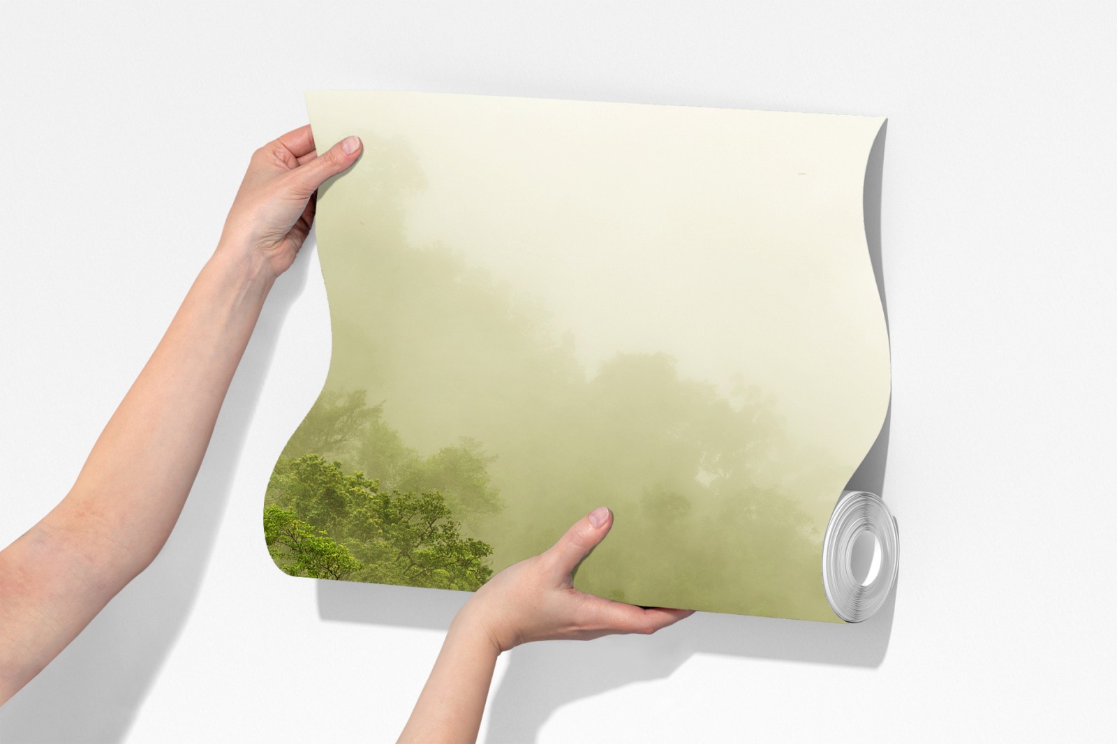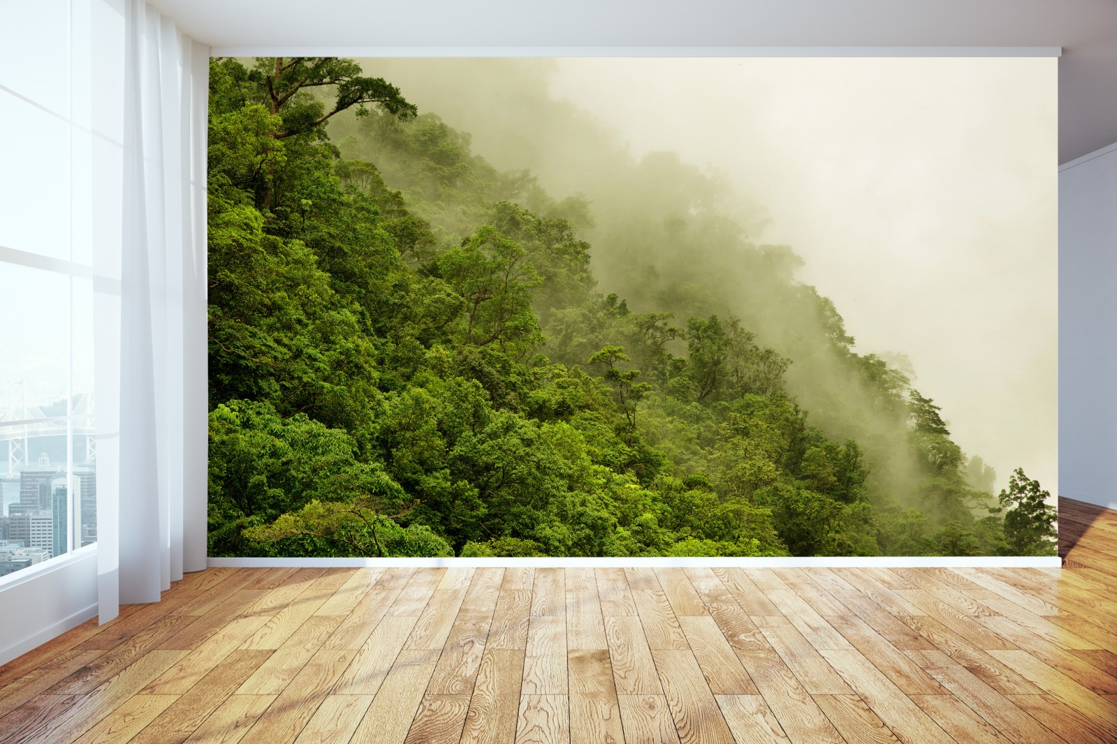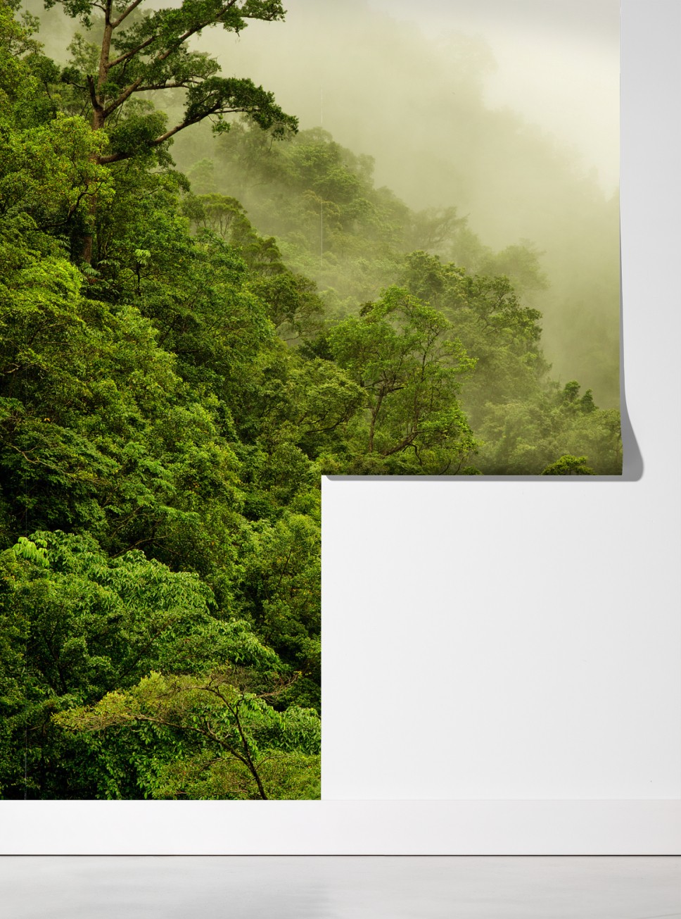 Üppiger grüner Regenwald im Nebel schafft eine beruhigende, eindringliche Landschaft, die ideal ist, um Natur ins Zuhause zu holen.