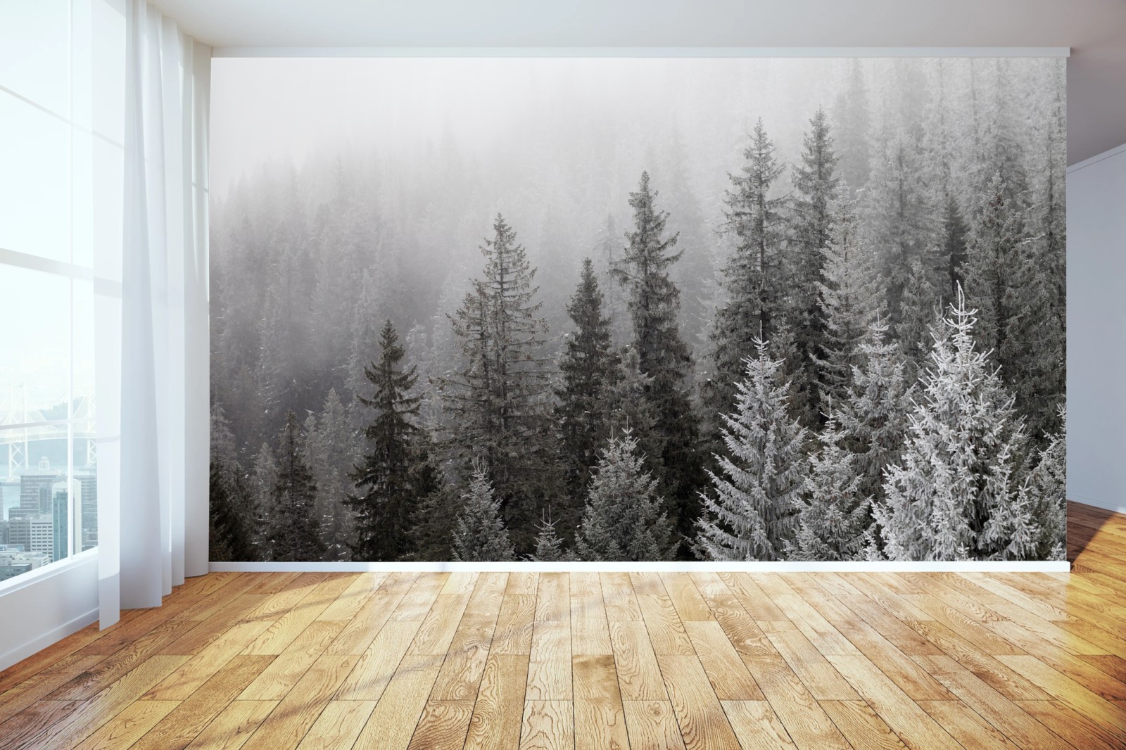 Eine ruhige, neblige Winterwaldszene aus den Karpaten bringt monochrome Schönheit und eine entspannte Atmosphäre an jede Wand.MehrWeniger