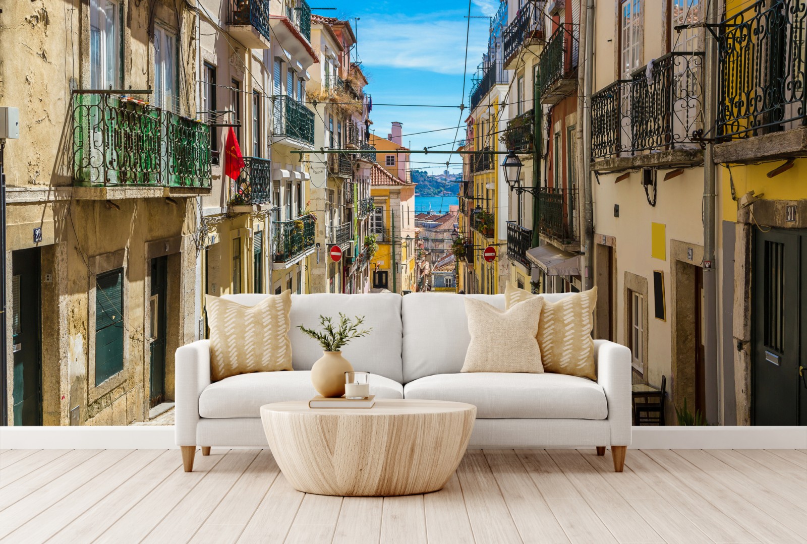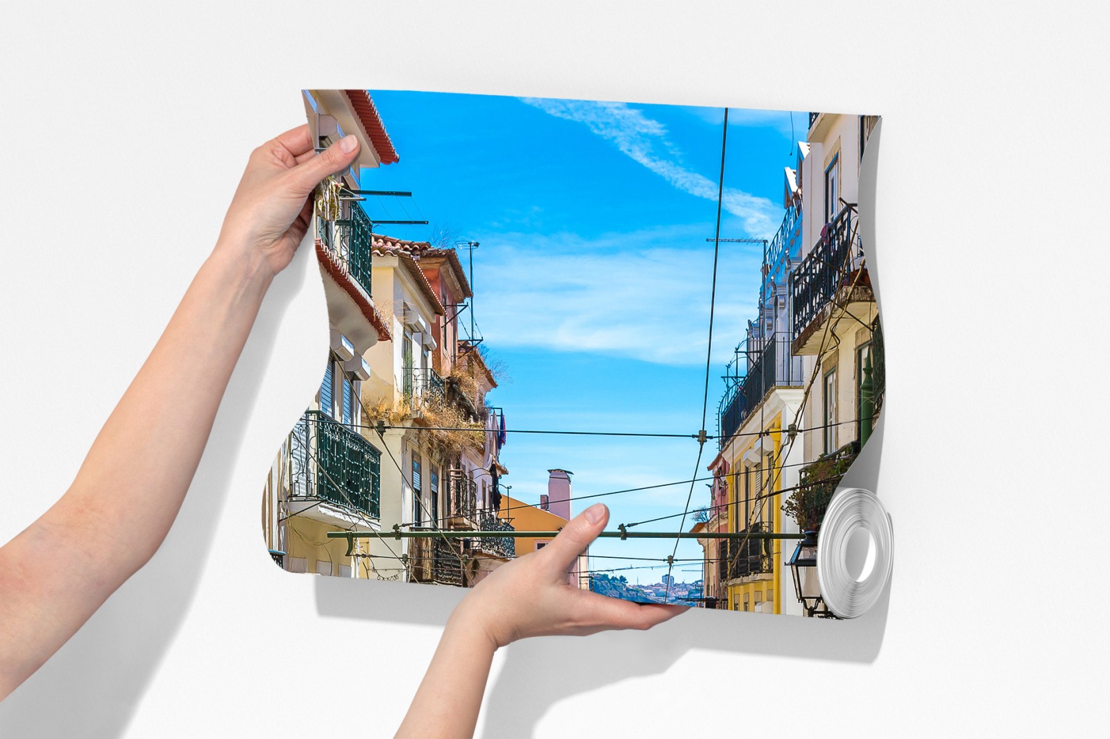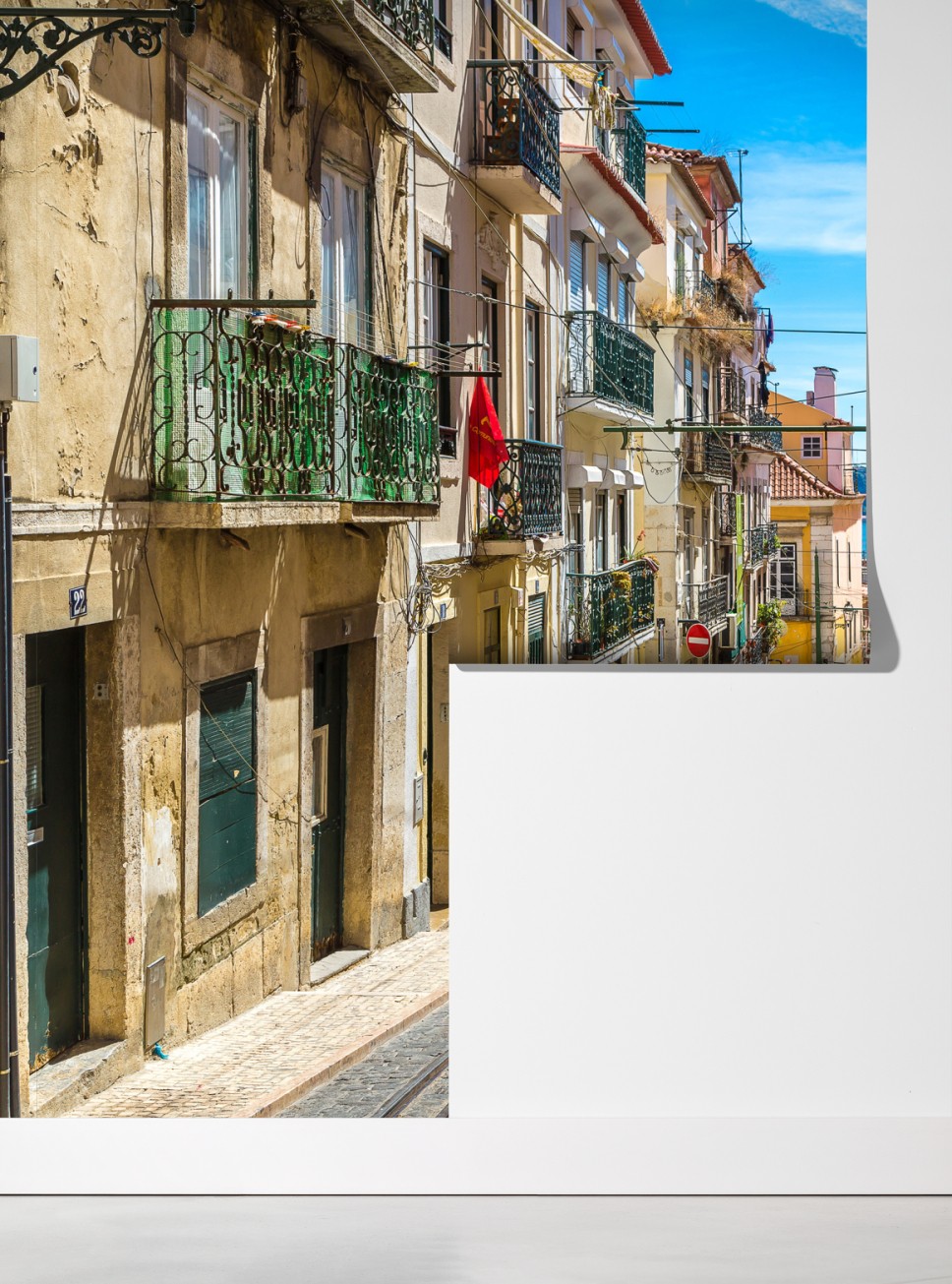Sonnendurchflutete Straße in Lissabon mit bunten Fassaden, Balkonen und Straßenbahnschienen, die mediterranes Flair in jeden Raum bringen.