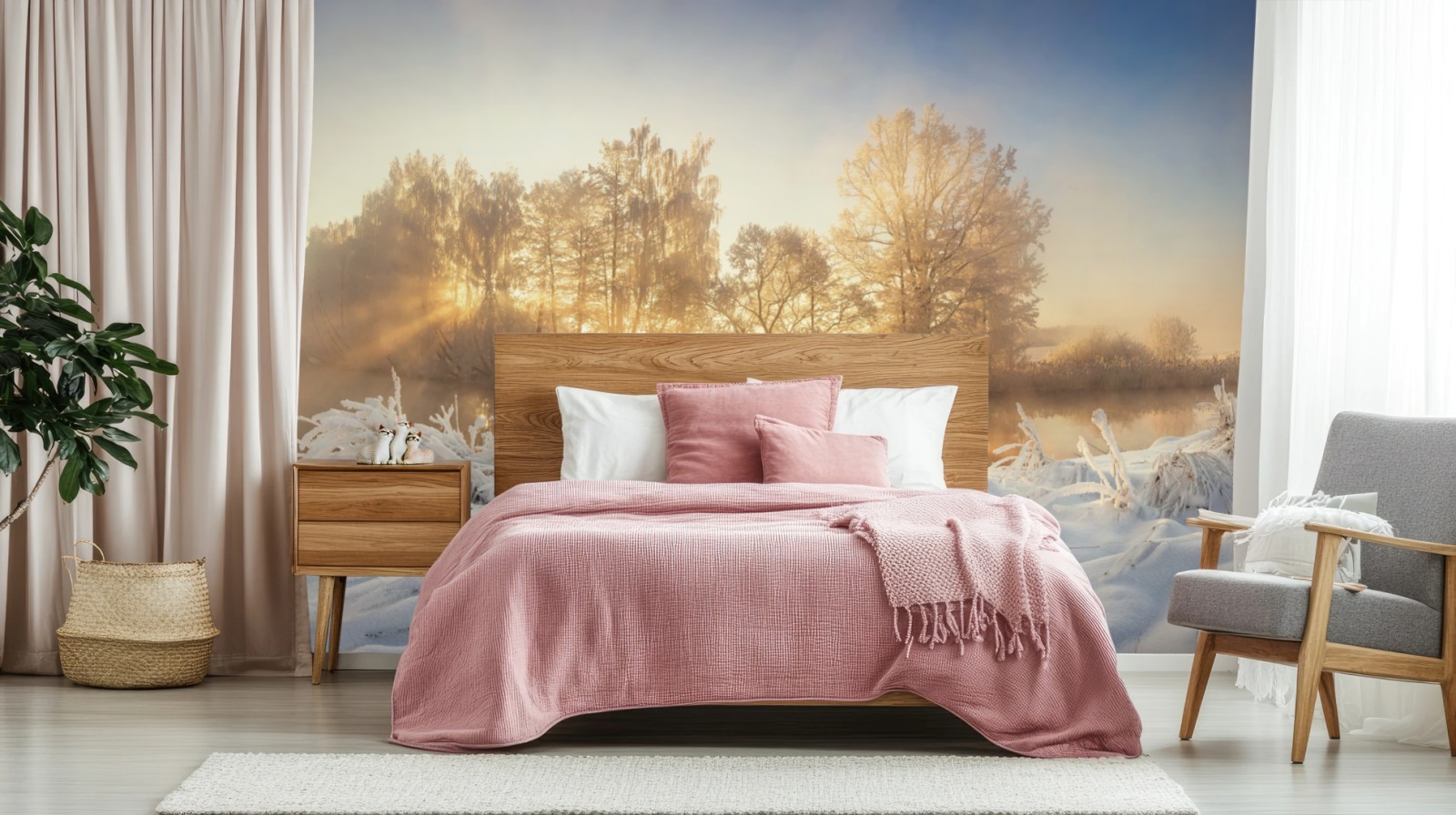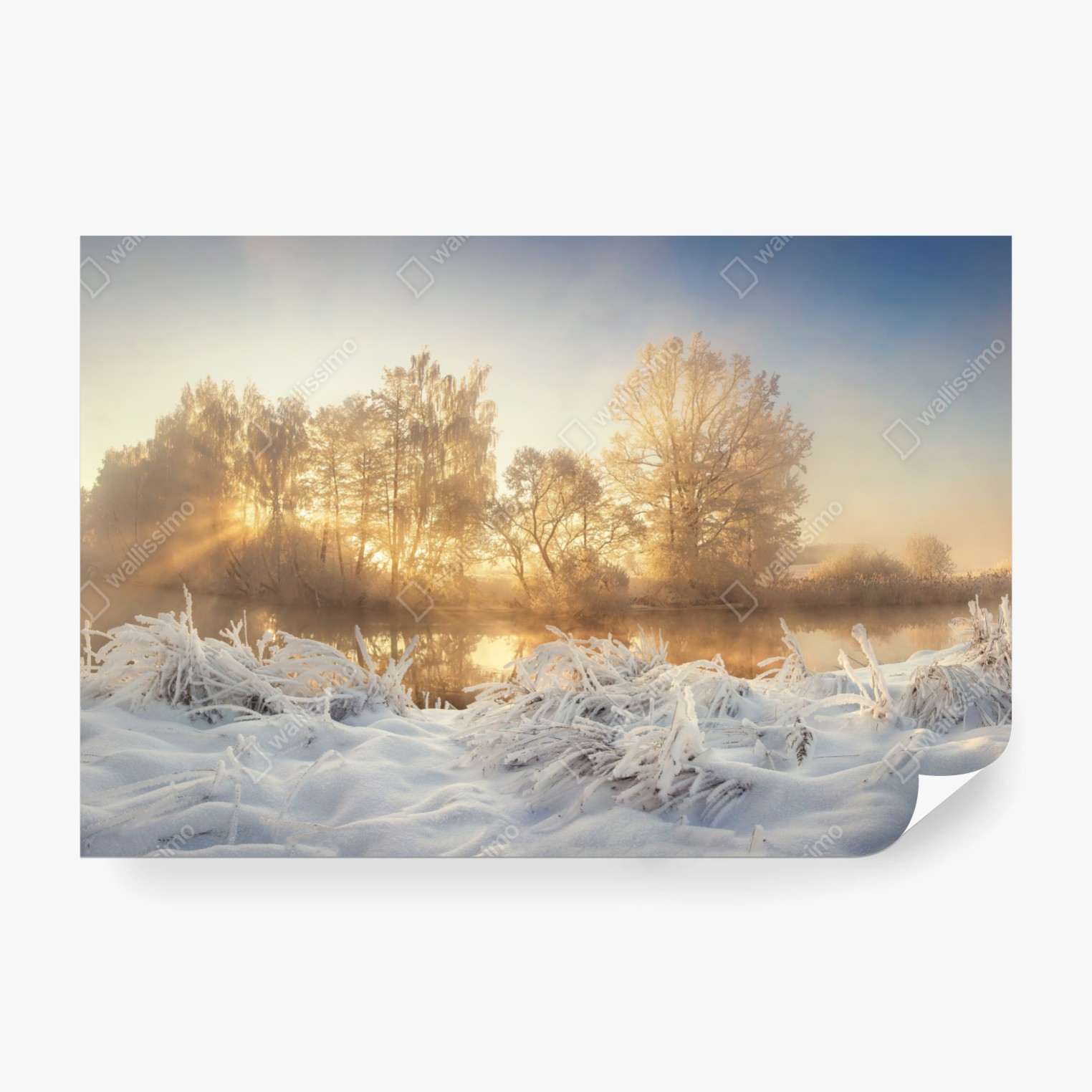 Fototapete Goldener wintersonnenaufgang über dem frostigen fluss