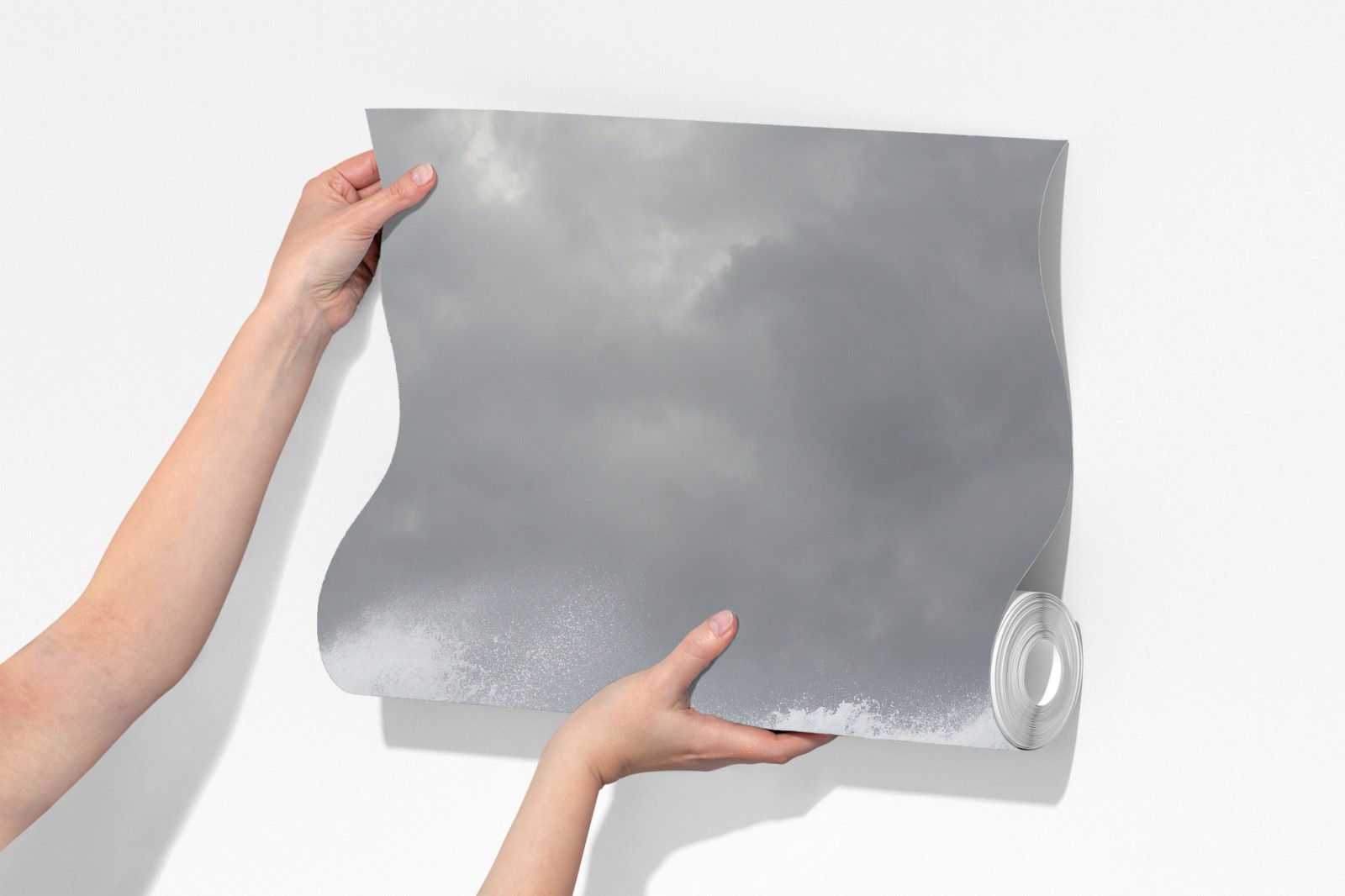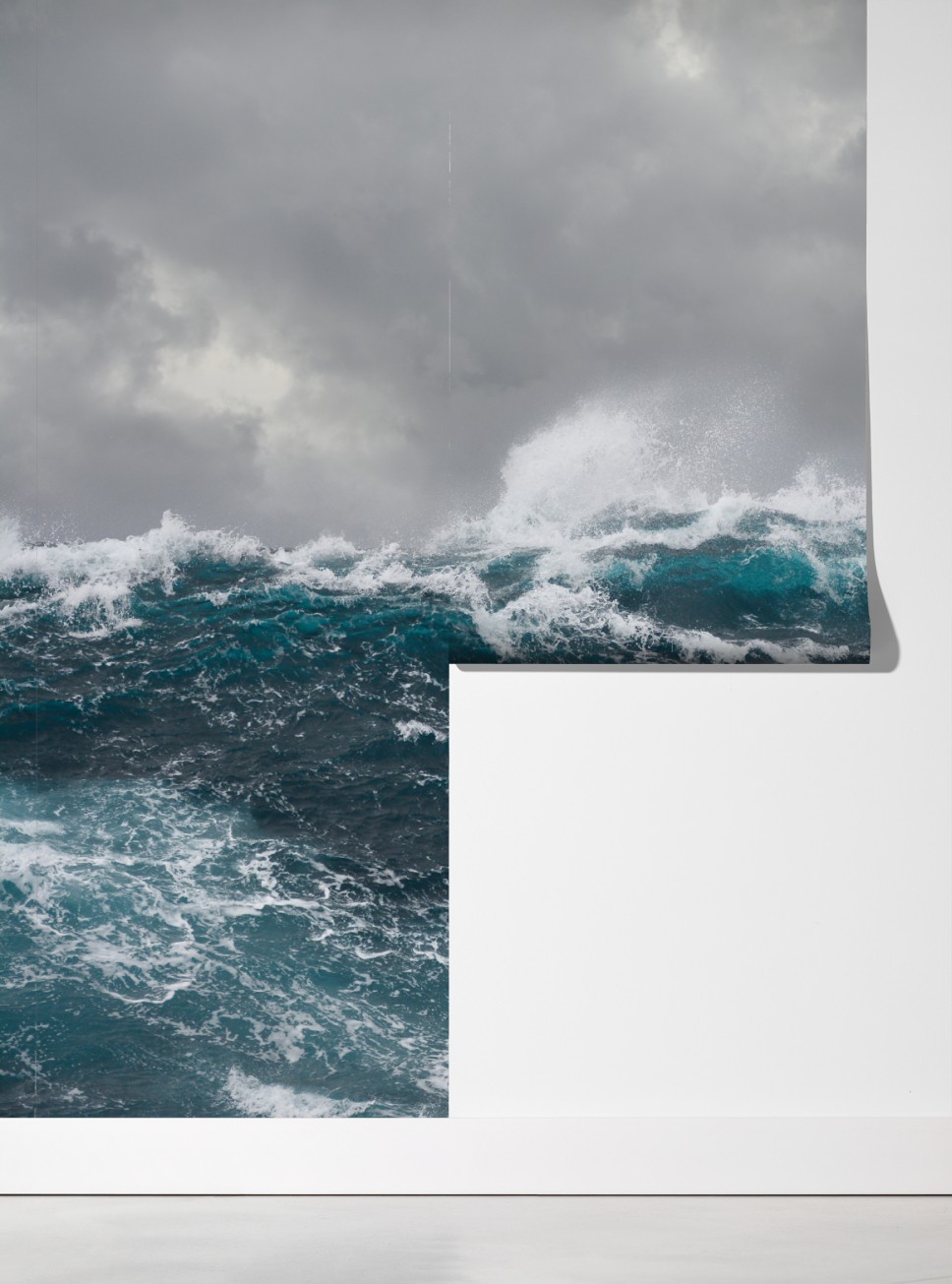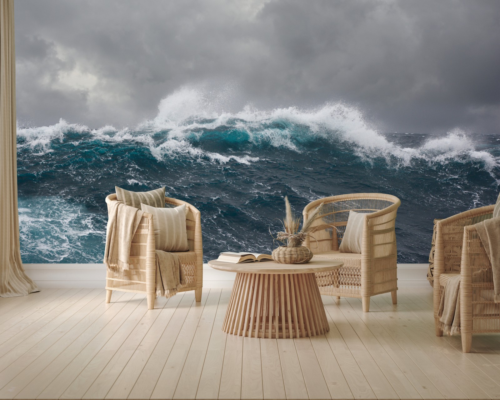 Eine dramatische Meereslandschaft, die die rohe Kraft des Ozeans unter stürmischem Himmel zeigt und jedem Raum Stimmung und Dynamik verleiht.