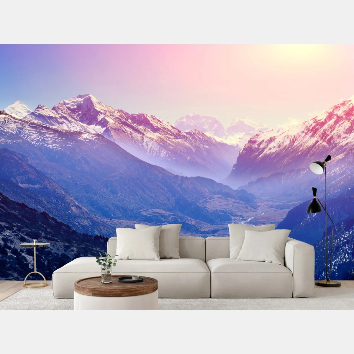 Fototapete Pastelliges bergtal bei sonnenaufgang