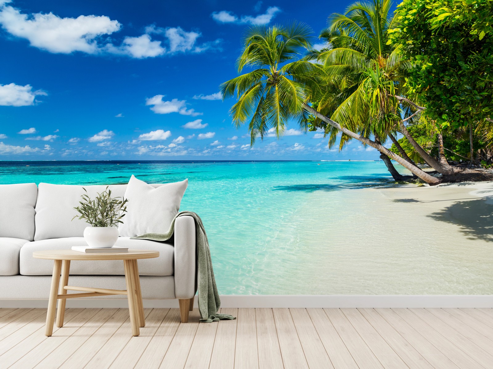 Fototapete Tropischer türkisstrand mit geneigten palmen