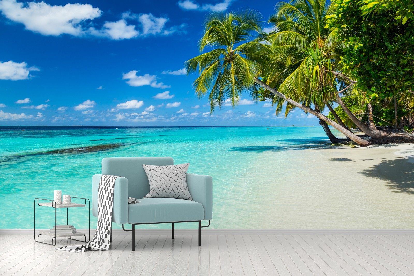 Fototapete Tropischer türkisstrand mit geneigten palmen