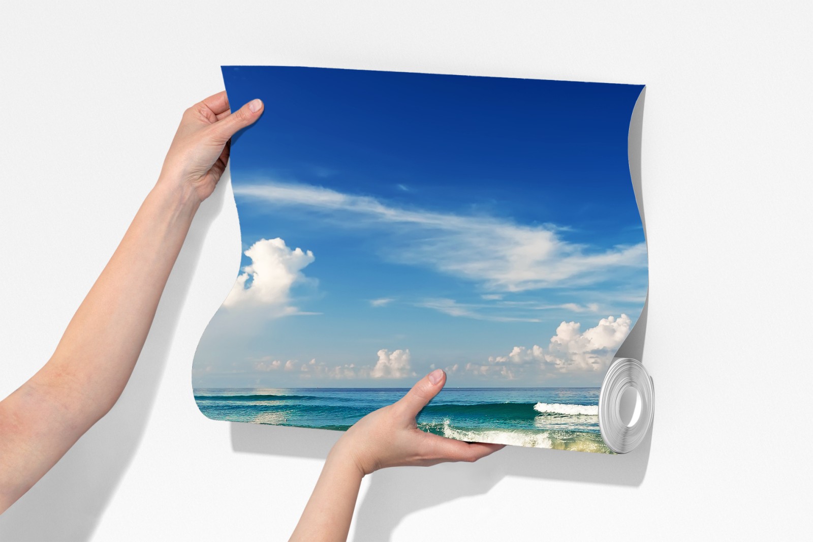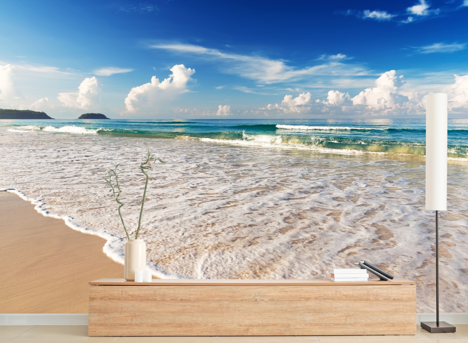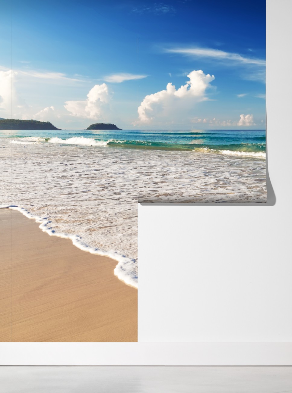 Eine ruhige Küstenszene vom Strand Karon in Phuket mit türkisfarbenen Wellen, weichem Sand und klarem blauen Himmel, die Ruhe und Urlaubsfeeling in jeden Raum bringt.