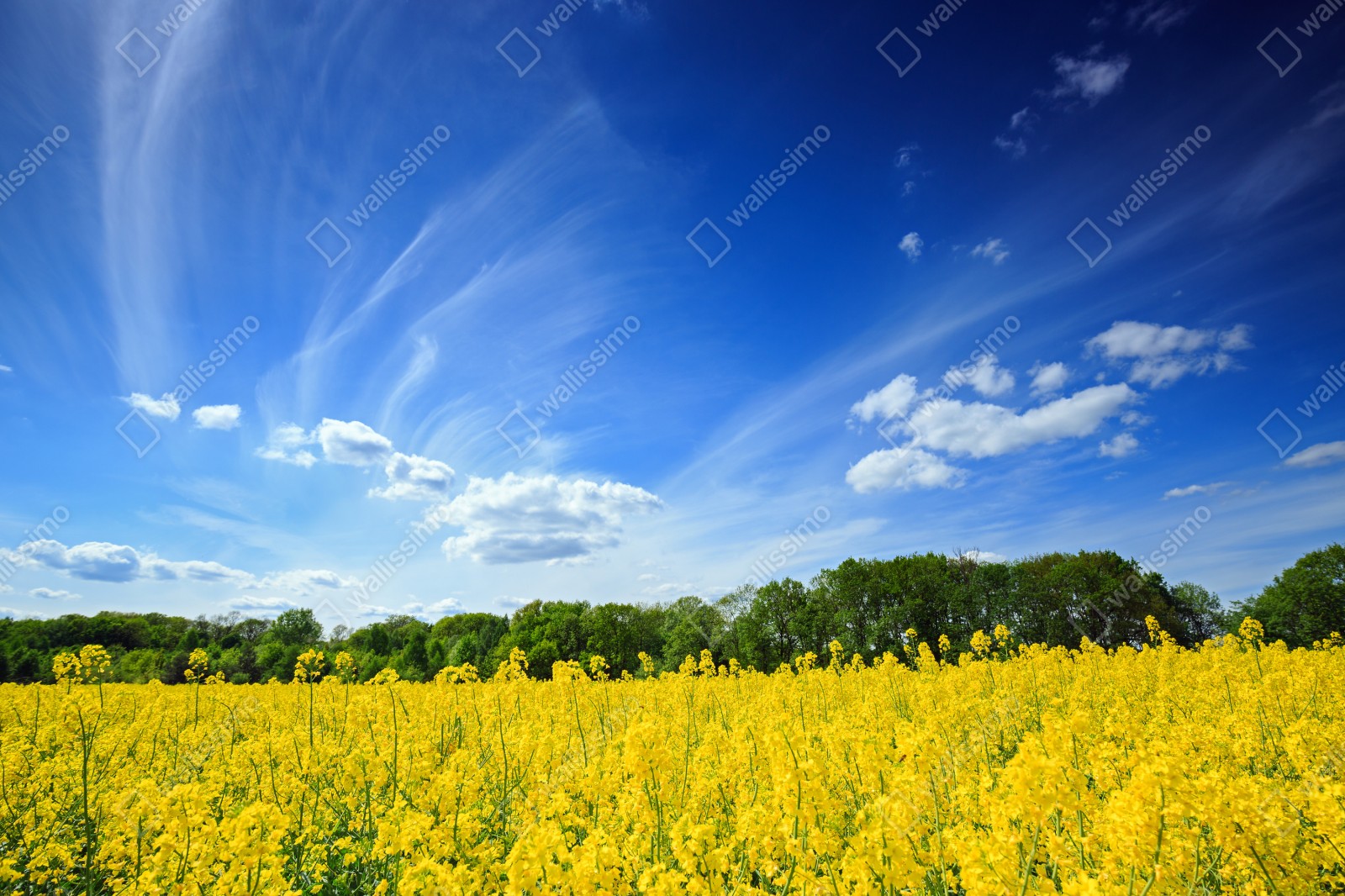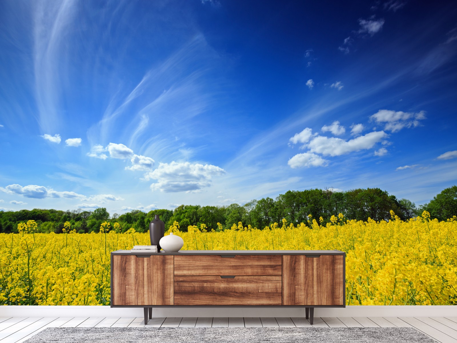 Lebendiges polnisches Rapsfeld in voller Blüte unter dramatischem blauem Himmel, perfekt, um natürliche Energie in Ihr Zuhause zu bringen.