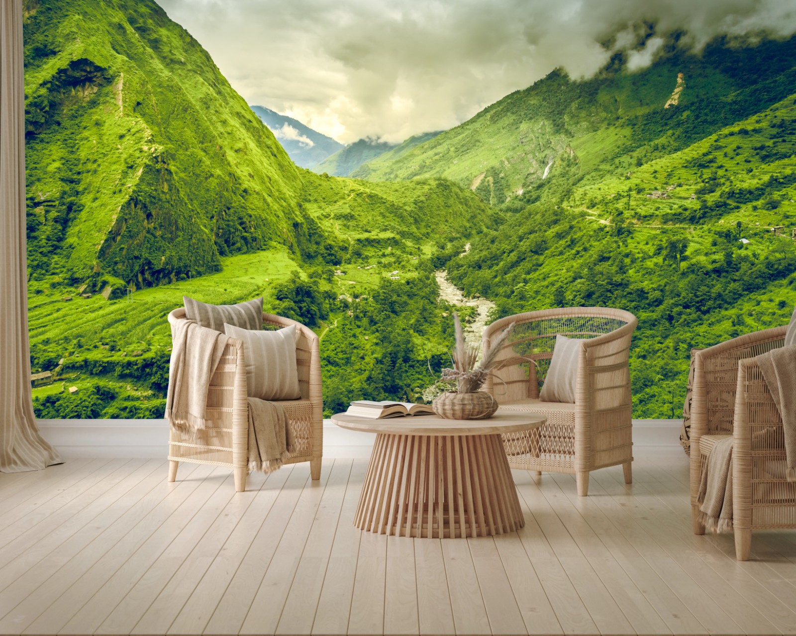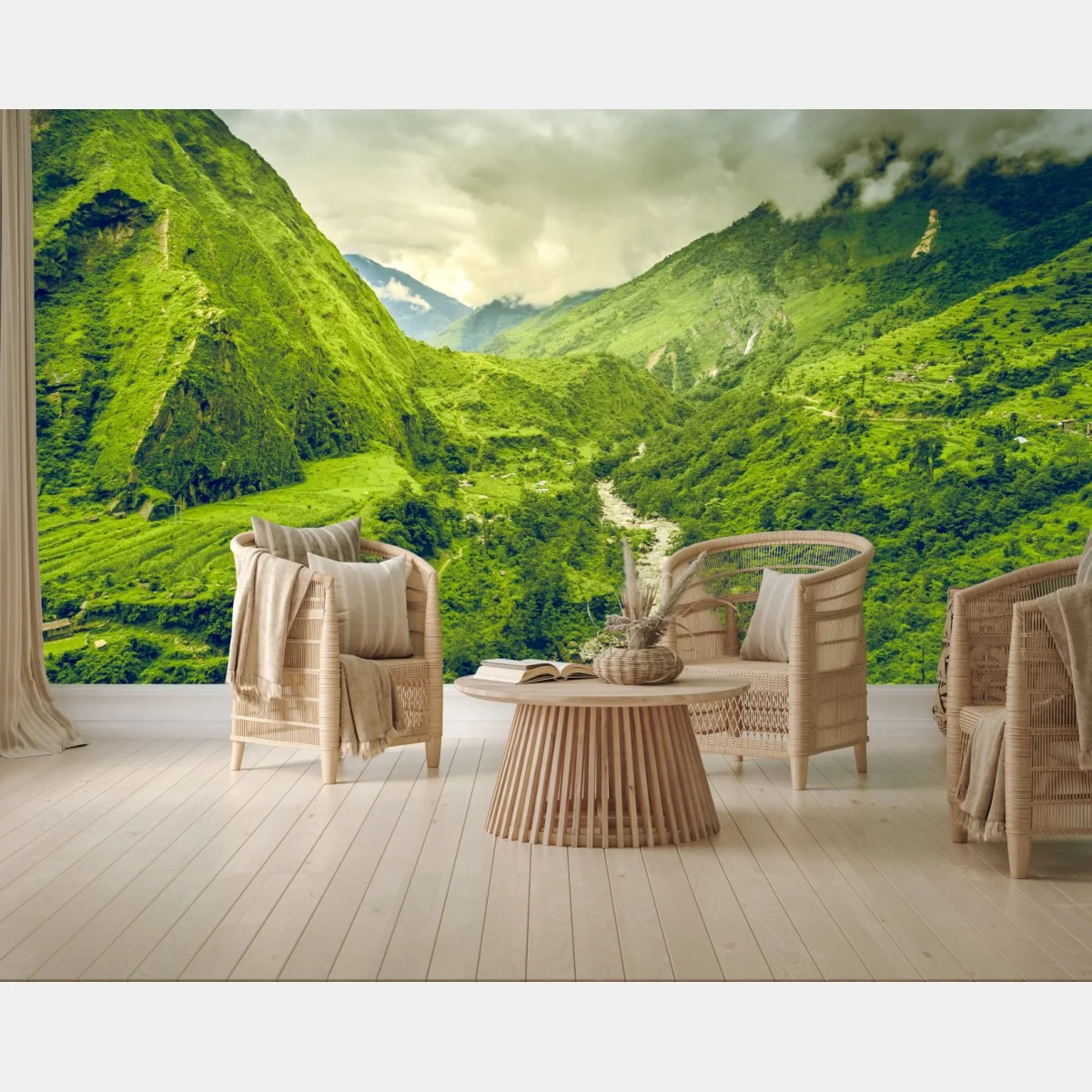 Fototapete Üppiges grünes bergtal mit fluss