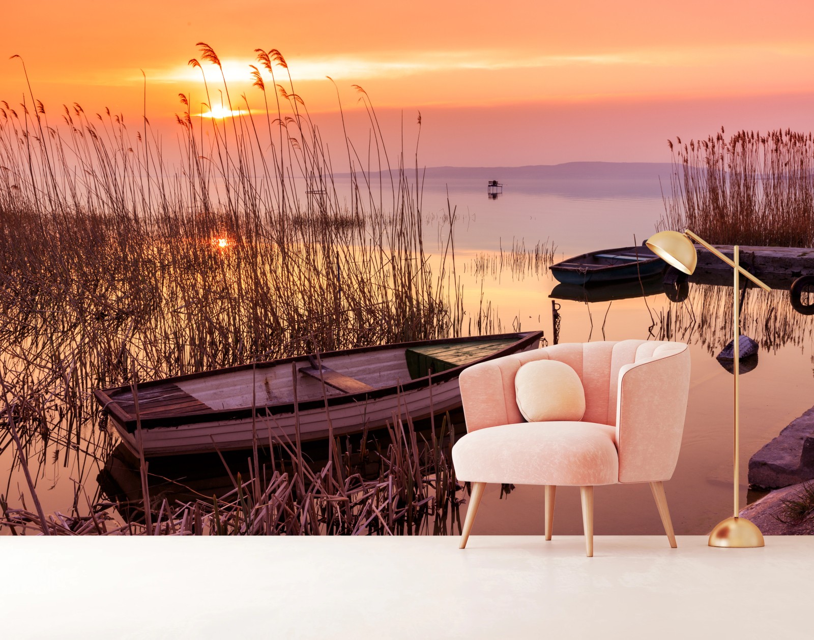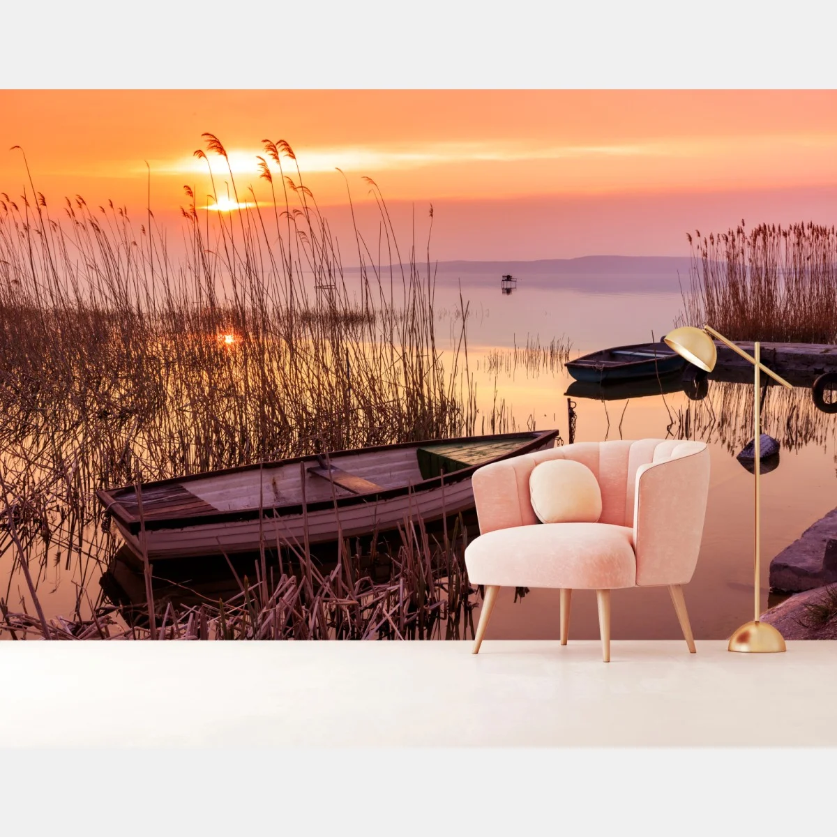Fototapete Sonnenuntergang am see mit vertäuten booten
