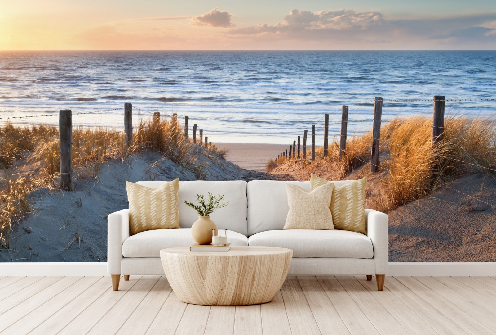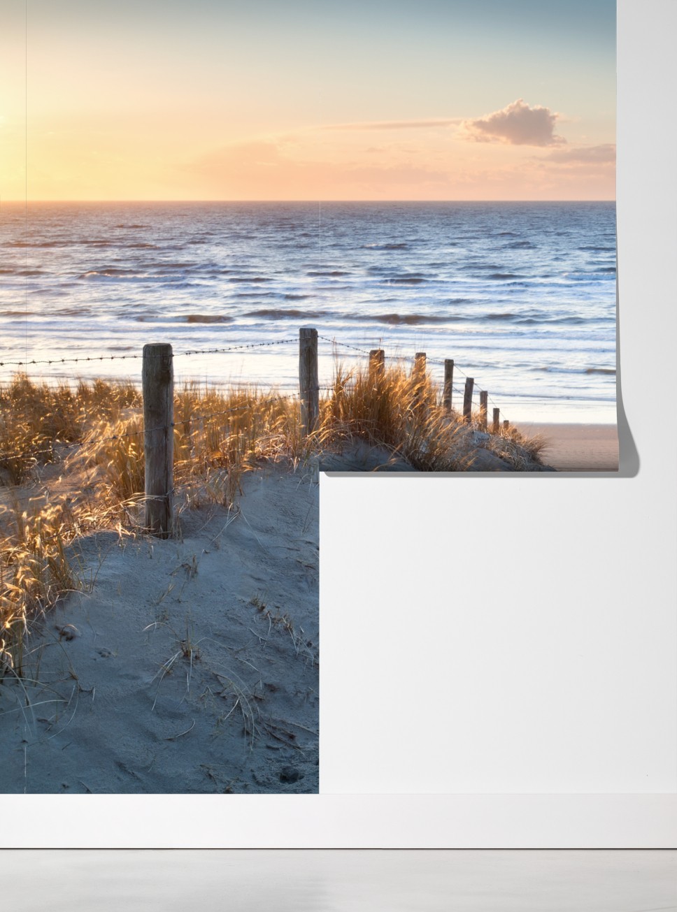 Ein ruhiger Sonnenuntergang über einem sandigen Pfad zur Nordsee in Holland, ideal um eine maritime Atmosphäre ins Zuhause zu bringen.