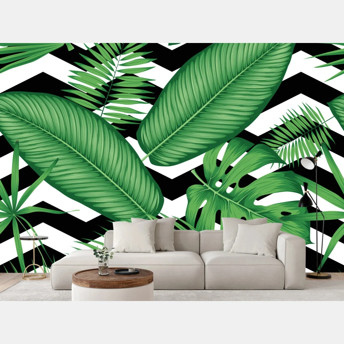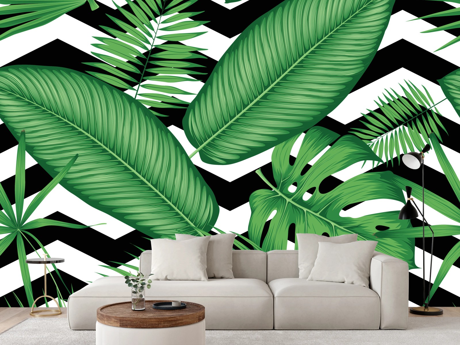 Fototapete Tropisches blättermuster auf zickzack-hintergrund