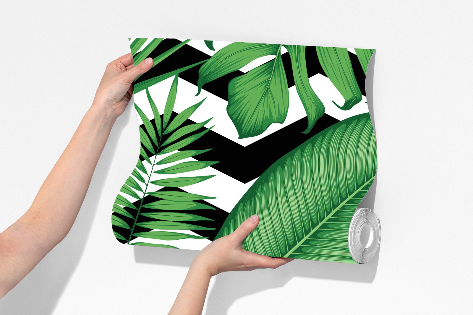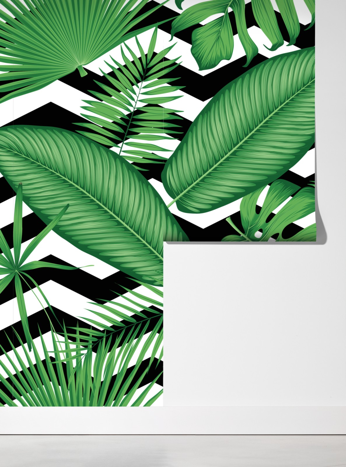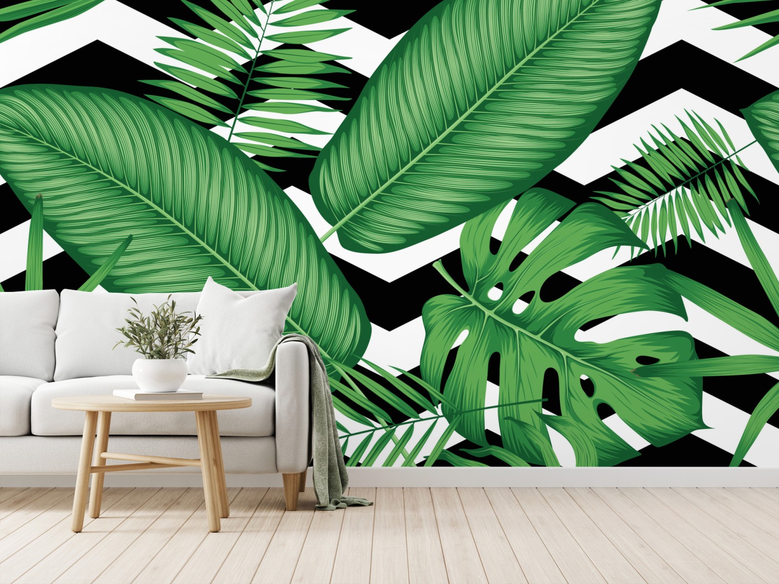 Kräftige tropische Blätter auf schwarzem-weißem Zickzack-Hintergrund bringen lebendiges Grün und modernen grafischen Kontrast in jeden Raum.