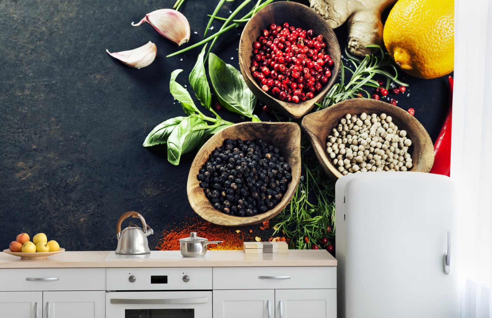 Bringen Sie den Duft der Küche an die Wand mit dieser lebendigen Anordnung aus Gewürzen und frischen Kräutern, ideal um Wärme und Geschmack ins Zuhause zu bringen.MehrWeniger