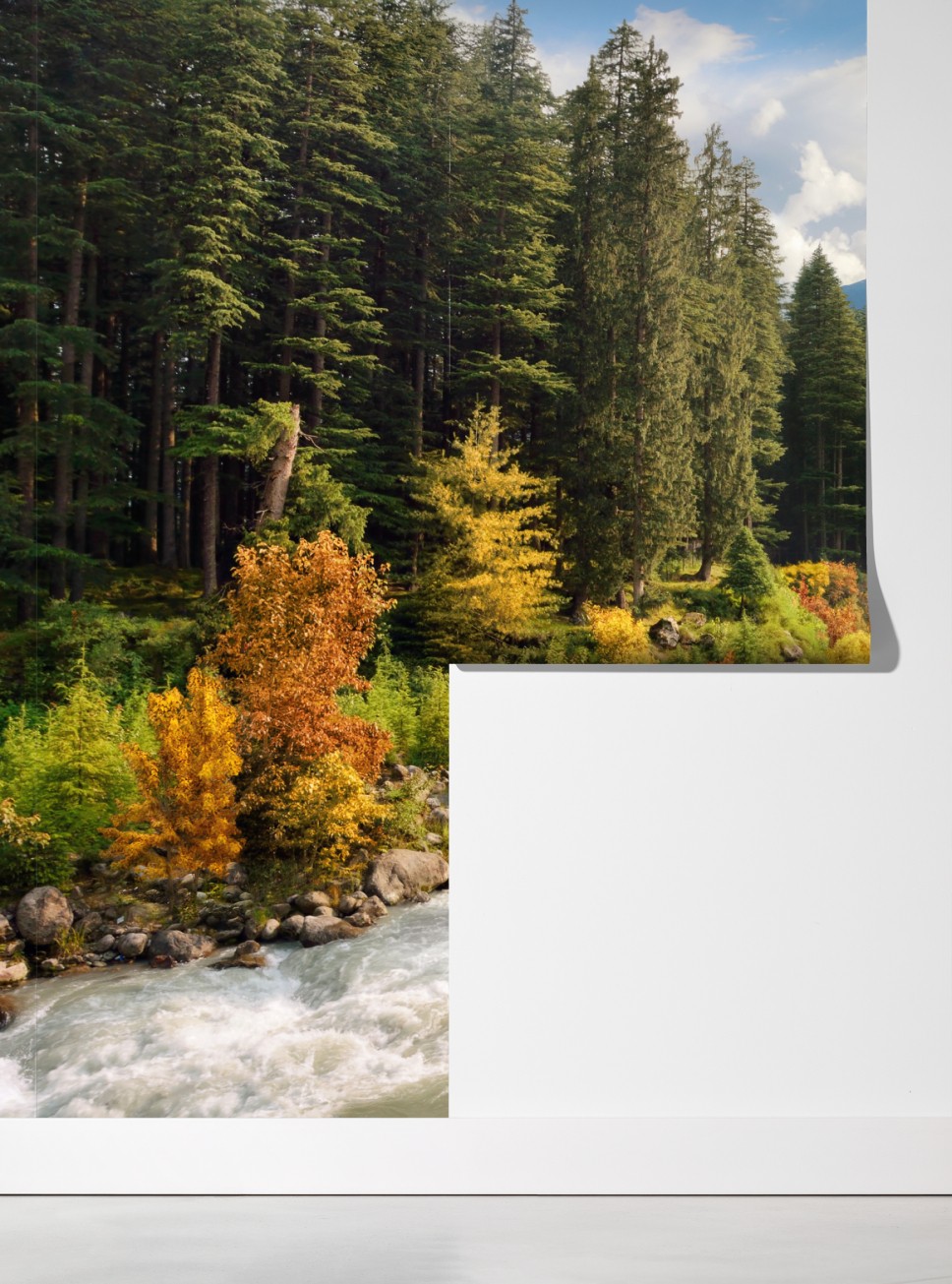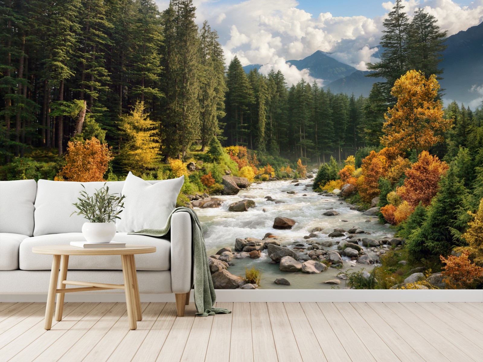 Erleben Sie die ruhige Schönheit eines Gebirgsflusses im Herbst mit leuchtenden Farben und nebelverhangenen Gipfeln, ideal zur Gestaltung wohnlicher Räume.