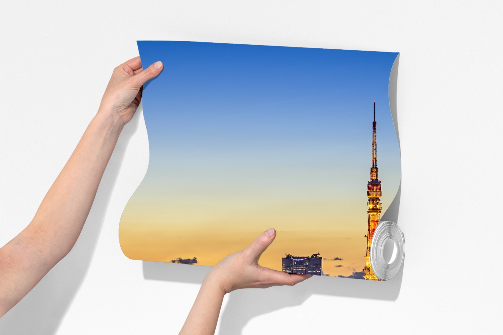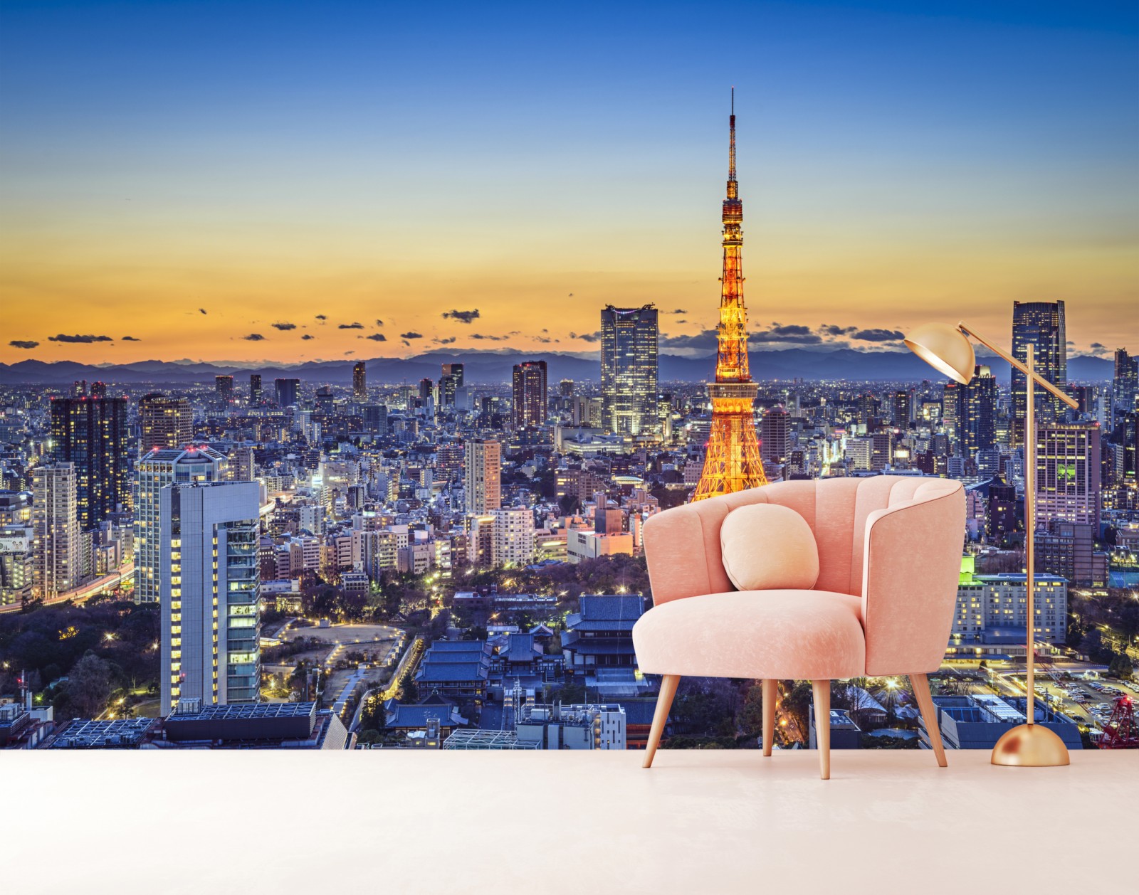 Lebendige Dämmerungsaufnahme von Tokio mit dem beleuchteten Tokyo Tower über einer funkelnden Stadtsilhouette, ideal für moderne Räume.