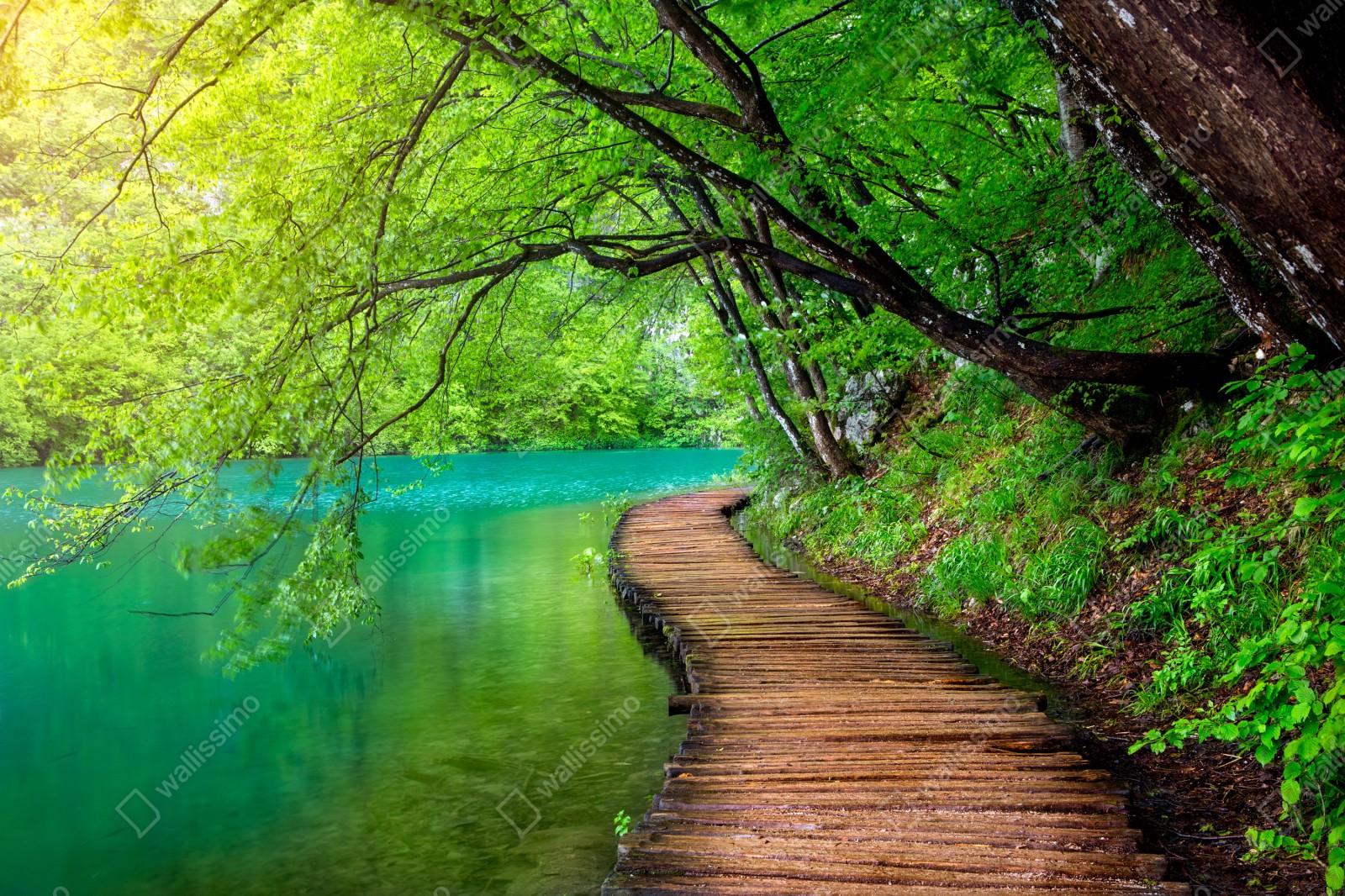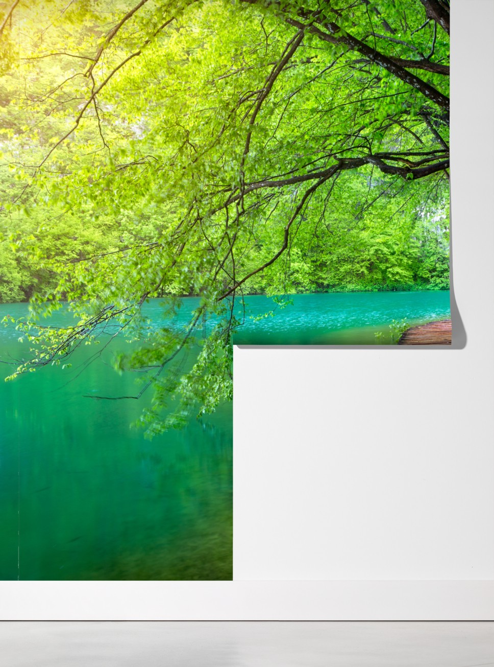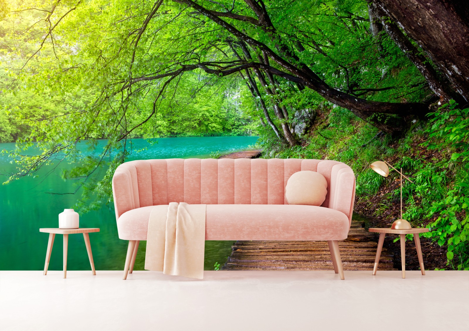Eine ruhige Seenlandschaft mit einem geschwungenen Holzsteg durch üppige grüne Bäume, die natürliche Atmosphäre ins Zuhause bringt.