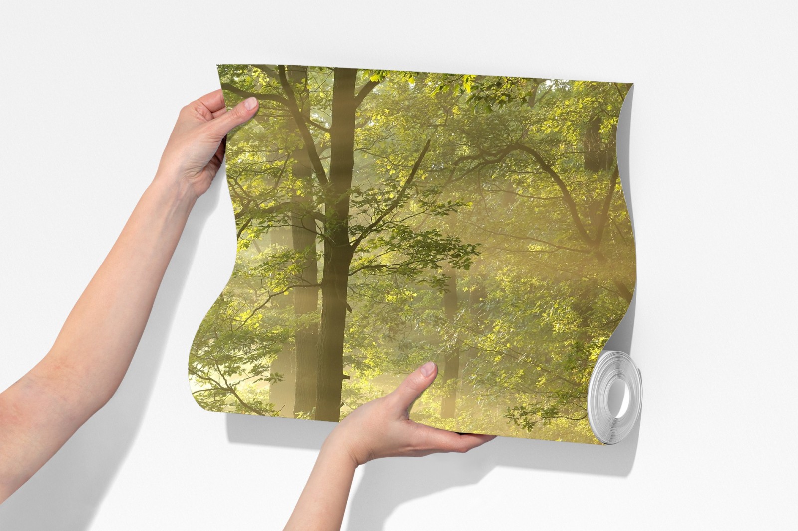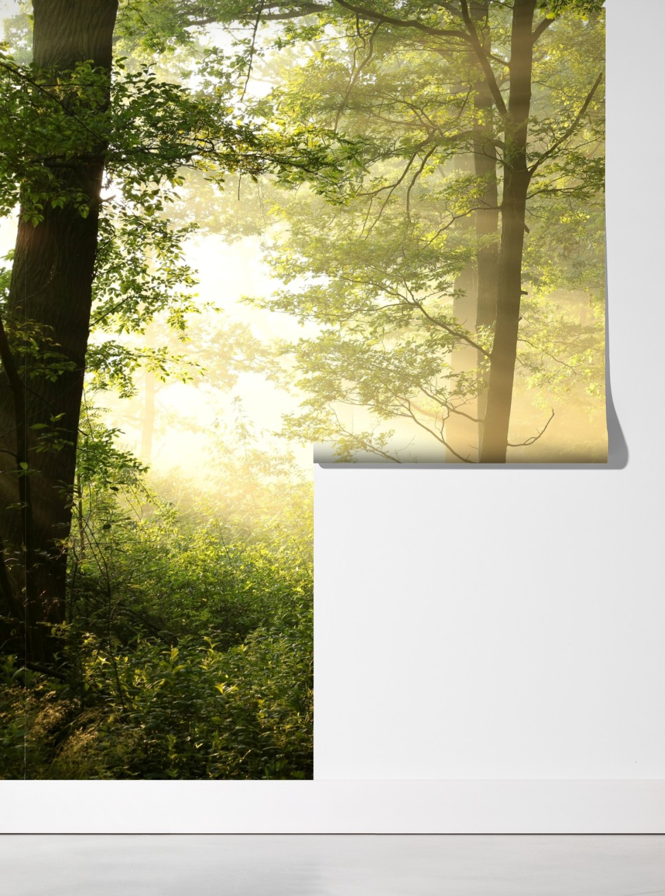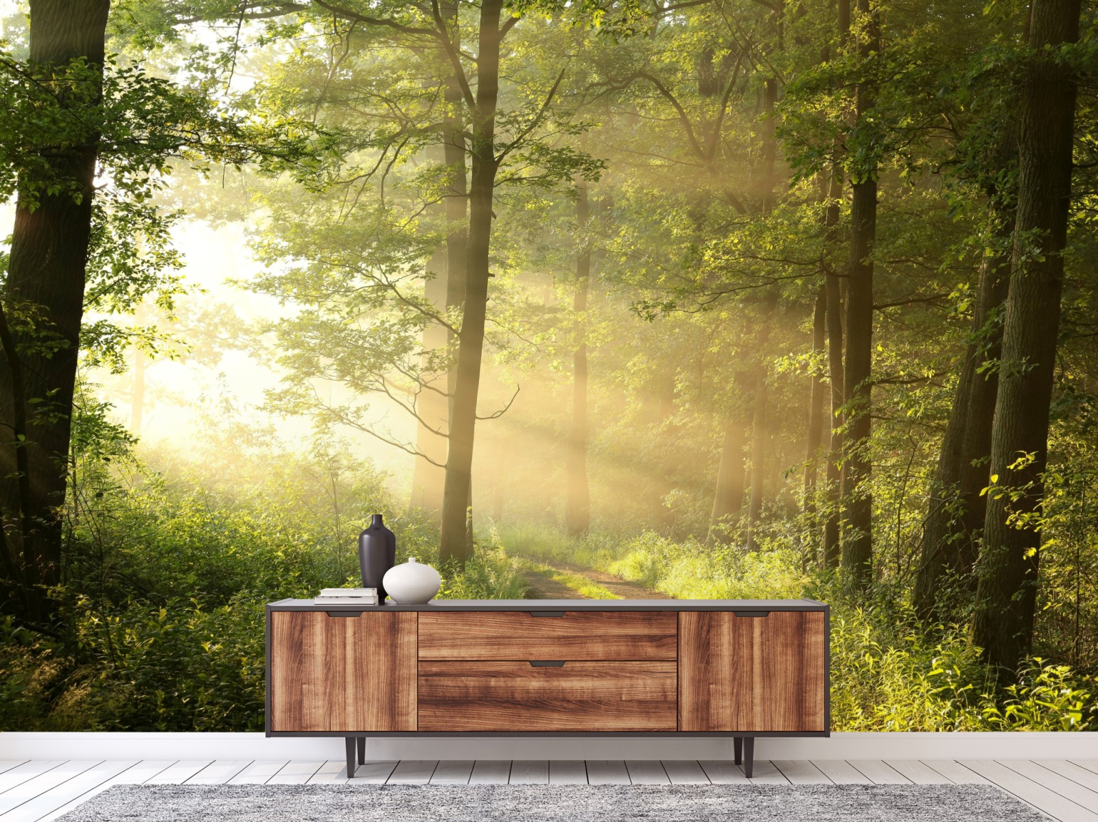 Ein ruhiger Waldweg im warmen Morgenlicht, der natürliche Ruhe und frische grüne Töne in Ihren Raum bringt.